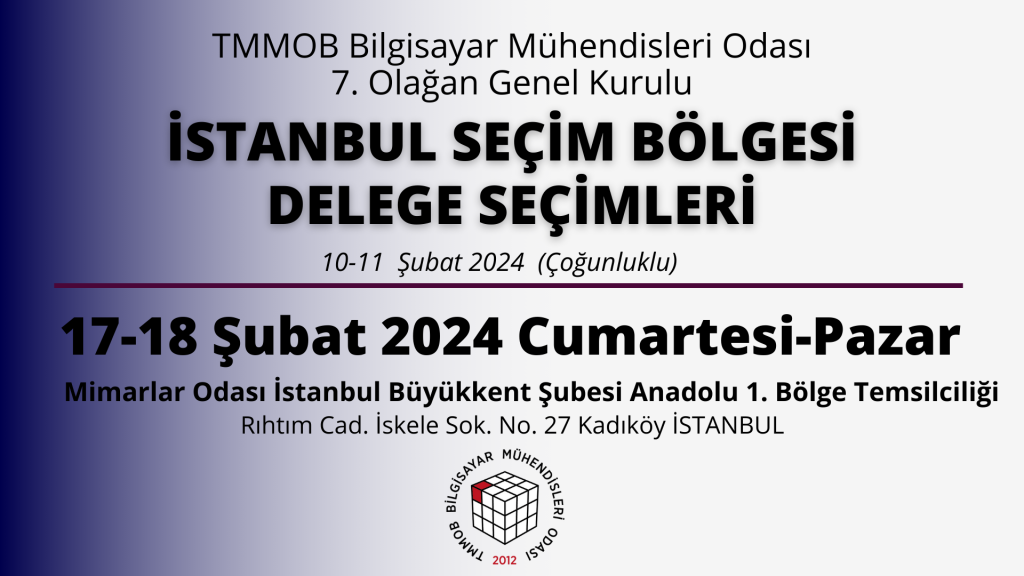 Delege seçimleri, 10 Şubat 2024 Cumartesi günkü toplantıda çoğunluk sağlanamaması durumunda aynı gündemle 17-18 Şubat 2024 Cumartesi-Pazar günleri “Mimarlar Odası İstanbul Büyükkent Şubesi Anadolu 1. Bölge Temsilciliği Rıhtım Cad. İskele Sok. No. 27 Kadıköy- İSTANBUL” adresinde yapılacaktır.