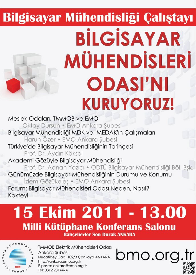 Bilgisayar Mühendisleri Odası kurma girişimlerinin bir ön çalışması olarak `Bilgisayar Mühendisliği Çalıştayı` 15 Ekim 2011 tarihinde Milli Kütüphane Konferans Salonu`nda geniş katılım ile düzenlendi.
