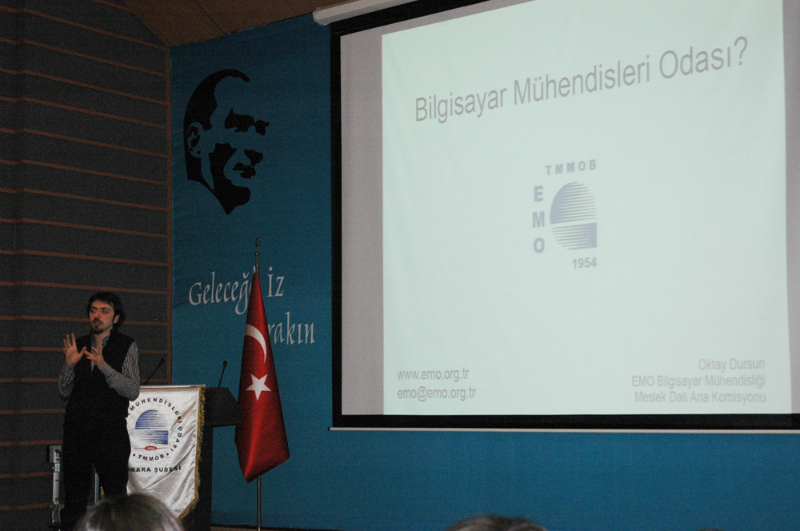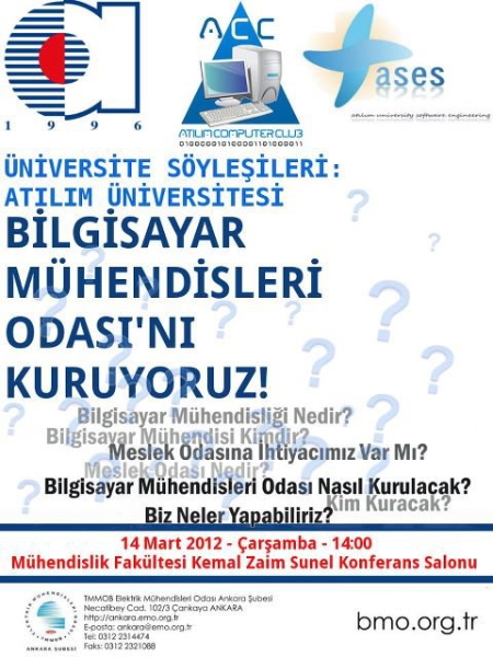 14 Mart Çarşamba günü, Atılım Üniversitesi’nde Bilgisayar, Yazılım ve Bilişim Sistemleri Mühendisliği bölümlerinin öğrencilerine yönelik olarak Bilgisayar Mühendisleri Odası ve kuruluş çalışmaları hakkında bilgilendirme sunumu yapıldı. Bilgisayar ve Yazılım Mühendisliği bölümü kulüplerinin de desteğiyle gerçekleştirilen etkinlikte, EMO Ankara Şubesi Örgütlenme Sekreteri Oktay Dursun’un gerçekleştirdiği sunum sonrası soru ve cevaplarla, mühendislik, mühendislik eğitimi ve meslek odaları konusu tartışıldı. Özellikle yetkin ve yetkili mühendislik uygulamaları, akreditasyon süreçlerinin mühendisler açısından sakıncalarının da konuşulduğu etkinlik, 23-24-25 Mart 2012 tarihinde gerçekleştirilecek EMO Genel Kurulu’nda çıkacak olan BMO kararının önemi vurgusuyla, 24 Mart 2012’de Genel Kurulun gerçekleştirileceği Kocatepe Kültür Merkezi’nde (Ankara) buluşmak üzere sona erdi.