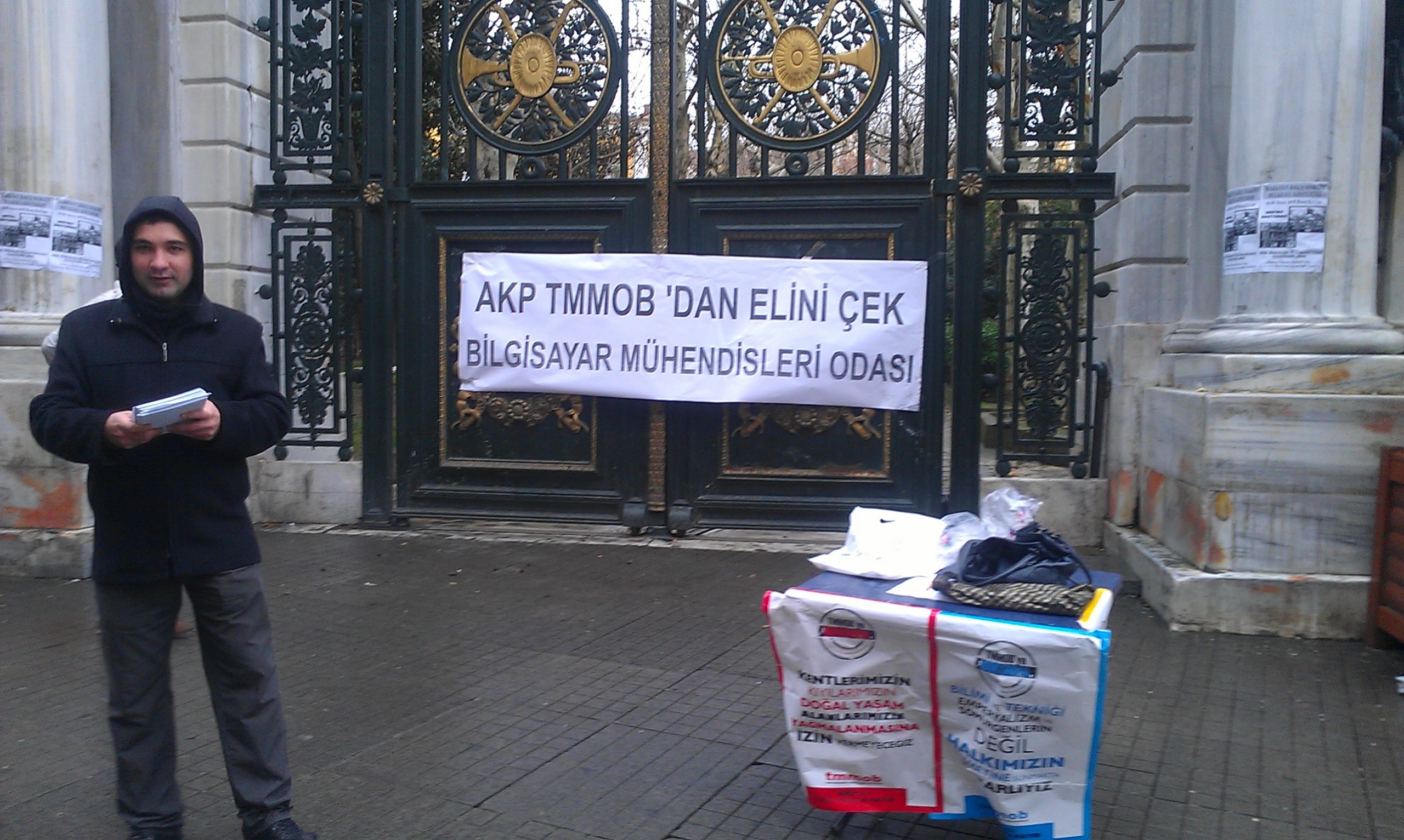 AKP’nin TMMOB’a yönelik saldırı yasasına karşı Bilgisayar Mühendisleri Odası tarafından 29 Aralık 2012 cumartesi günü 13:30 – 15:30 saatleri arasında Taksim Galatasaray Lisesi önünde masa açılarak bildiri dağıtılmıştır. 2 saat süren bildiri dağıtımında, iktidara geldiği günden bu yana halkın tüm kesimlerine saldıran AKP hükümetinin şimdiki hedefinin de mühendis, mimar ve şehir plancılarının örgütlü gücü olan TMMOB olduğu halka anlatılmıştır. “AKP TMMOB’DAN ELİNİ ÇEK” pankartının yer aldığı masada 400 adet bildiri dağıtılırken, 50 adet imza toplanmış ve 80 adette “TMMOB SUSTURULAMAZ” sticker’ı yapıştırılmıştır.