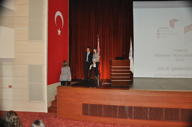 DSC_02445 – 6 Nisan 2013 tarihlerinde Eskişehir Osmangazi Üniversitesi Bilgisayar ve Bilişim Teknolojileri Kulübü tarafından gerçekleştirilen Bilişim Günleri etkinliğe katılan Bilgisayar Mühendisleri Odası Yönetim Kurulu Başkanı Gölay Şakiroğulları bir sunum gerçekleştirdi. Gölay Şakiroğulları sunumunda mühendislik, bilgisayar mühendisliği, bilgisayar mühendisliği eğitimi, meslek alanı ve sorunlarla ilgili bilgilendirme yaptı ve Bilgisayar Mühendisleri Odası’nın kuruluş süreci ve yapılan çalışmalardan bahsetti. Oturum sonunda Şakiroğulları’na Eskişehir Osmangazi Üniversitesi Bilgisayar Mühendisliği Bölüm Başkan Yardımcısı Yard. Doç. Dr. Selçuk CANBEK tarafından teşekkür plaketi takdim edildi.