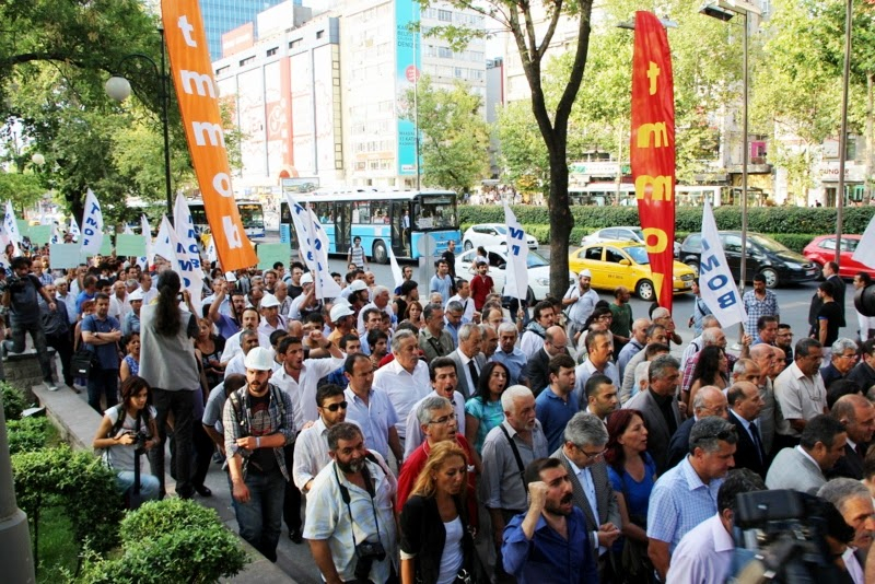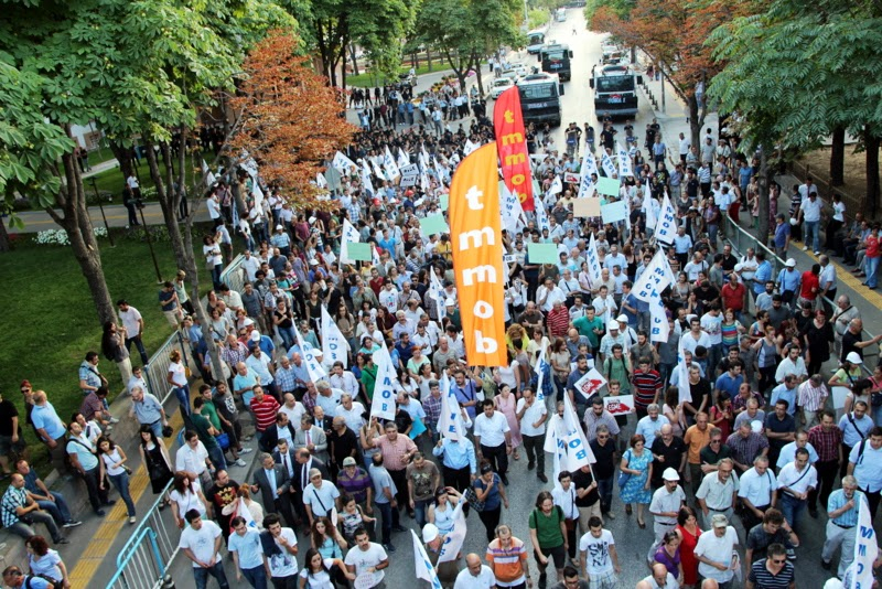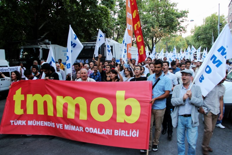 Kızılay Selanik Caddesinde bulunan TMMOB merkezi önünde toplanan mimar ve mühendisler, dayanışma için gelenlerle Çevre ve Şehircilik Bakanlığına yürüdüler. TMMOB Genel Başkanı Mehmet Soğancı`nın yaptığı açıklamanın ardından Çevre ve Şehircilik Bakanlığı`na siyah çelenk bırakıldı. AKP hükümetinin “torbacı” ve “darbeci” olduğunu söyleyerek konuşmasına başlayan TMMOB Genel Başkanı Mehmet Soğancı şunları söyledi;