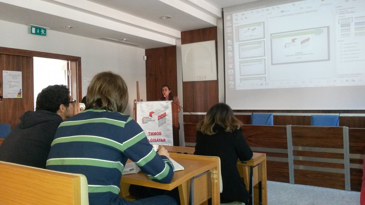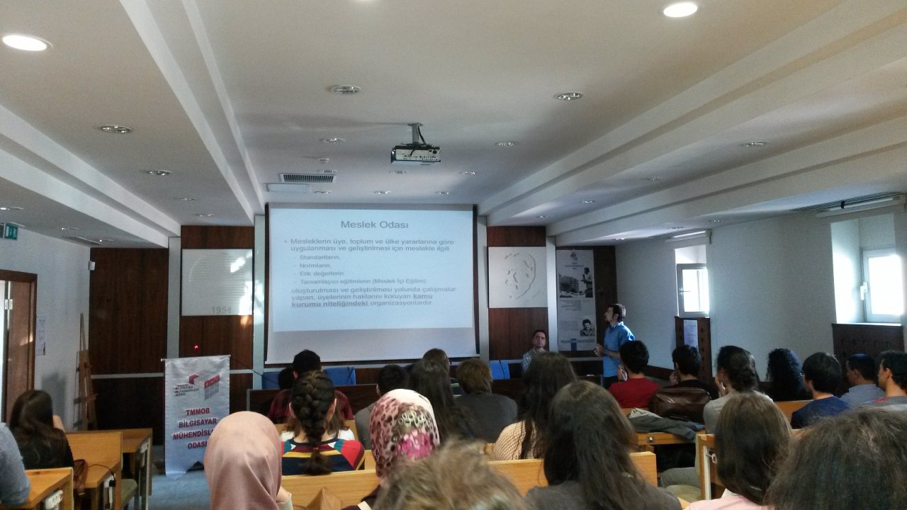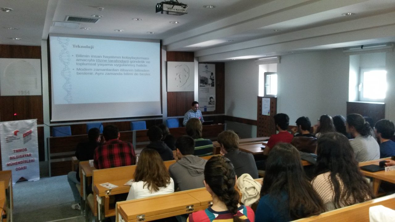 ODTÜ Bilgisayar Mühendisliği Bölümü Öğrencisi Irmak Doğan ve Bilgisayar Mühendisleri Odası Yönetim Kurulu Başkanı Gölay Şakiroğulları’nın açılış konuşmalarıyla başlayan toplantıda, BMO Yönetim Kurulu Yazman üyesi Birkan Sarıfakıoğlu “Mühendislik, Bilgisayar Mühendisliği ve Teknoloji” üzerine bir sunum yaparken, Oktay Dursun “TMMOB, Meslek Odaları ve Bilgisayar Mühendisliği” hakkında bilgi verdi.