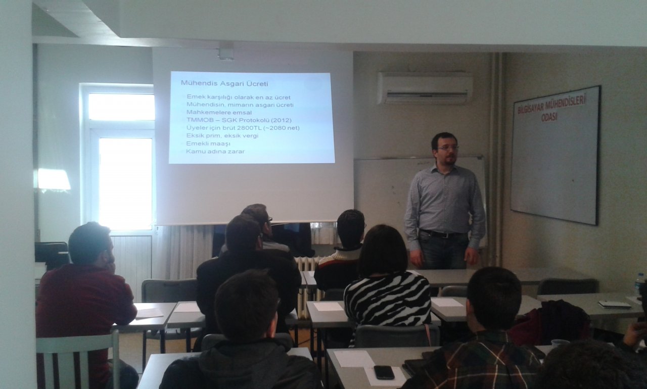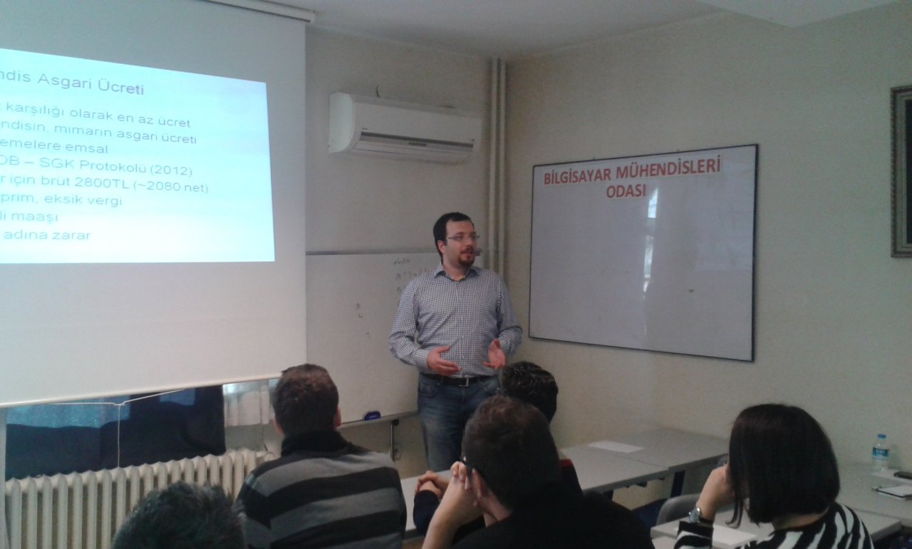 İş Hukuku Semineri 8 Şubat 2014 tarihinde, BMO Genel Merkezi’nde gerçekleştirildi. Bilgisayar Mühendisleri Odası Yönetim Kurulu üyesi Onur ÖZARDIÇ’ın TMMOB, BMO ve mesleki haklar konusunda sunumunun ardından Oda Avukatı Cem ERKAT bir sunum gerçekleştirildi.
