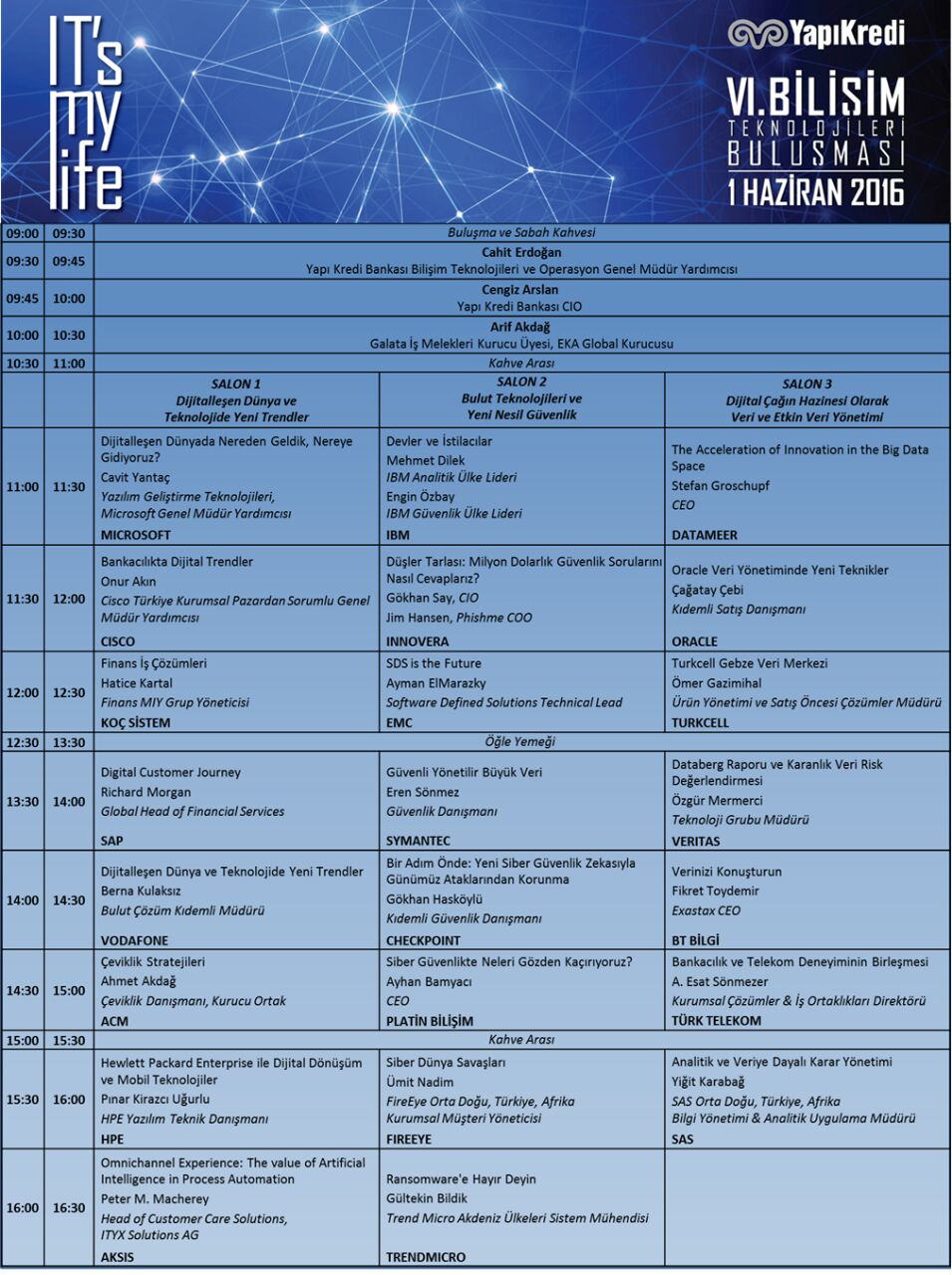 Yapı Kredi Bankası Bilgi Teknolojileri ve Operasyon Yönetimi tarafından geleneksel olarak her yıl düzenlenen “IT’s My Life” isimli bilişim teknolojileri buluşmalarının altıncısı 1 Haziran 2016 Çarşamba günü Yapı Kredi Bankacılık Üssü’nde gerçekleştirildi. Yapı Kredi Bankası’nda çalışan 1200’ün üzerinde bilişim çalışanın yanı sıra sektördeki farklı firmaları temsilen katılan meslektaşlarımızın da buluştuğu tüm gün süren etkinliğin bu yılki ana konuları “Siber Güvenlik” ve “Big Data” oldu.