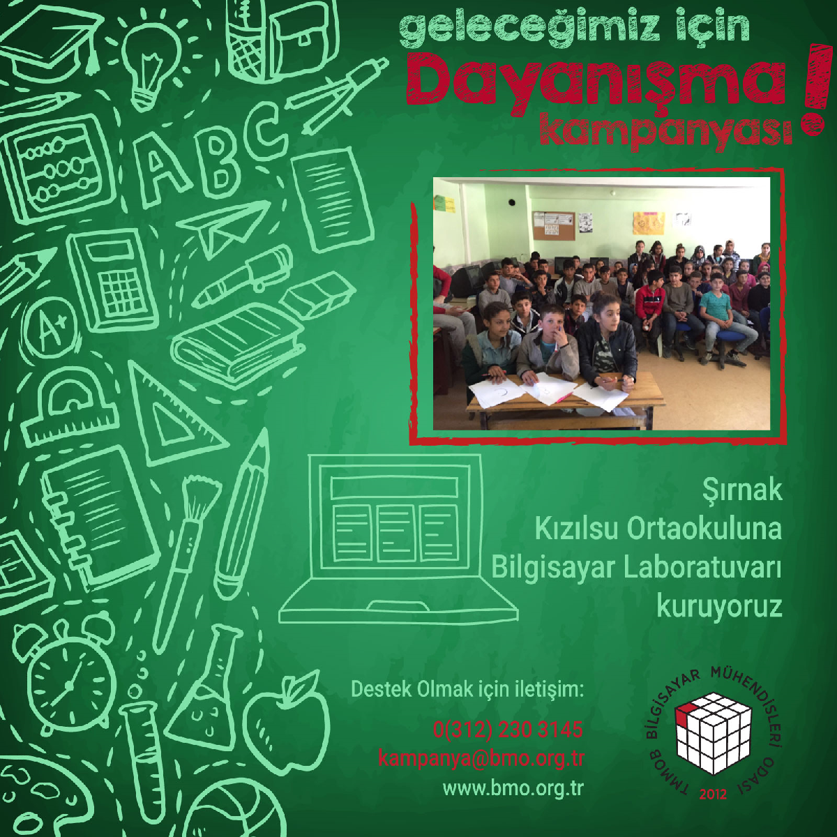 Şırnak Kızılsu köyündeki Şehit Abdulvahap Üstüner Ortaokulu’ndan gelen talep doğrultusunda başlatılan dayanışma kampanyası ile ilgili Yönetim Kurulu tarafından bir destek çağrısı yayınlanmıştır. Kampanyaya destek vermek isteyenler kampanya@bmo.org.tr adresi üzerinden iletişim kurabilir.