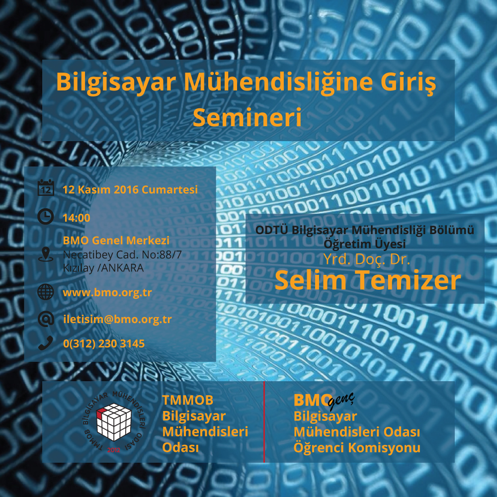 başlıklarını ODTÜ Bilgisayar Mühendisliği Bölümü öğretim üyesi Yrd. Doç. Dr. Selim Temizer‘in katılımıyla konuşmak üzere bütün öğrenci arkadaşlarımızı 12 Kasım cumartesi günü saat 14:00’da TMMOB Bilgisayar Mühendisleri Odası Genel Merkezinde gerçekleştirilecek seminere bekliyoruz.