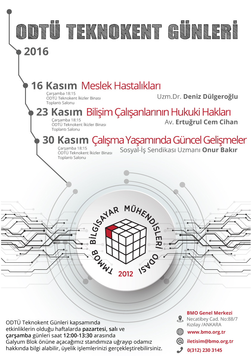 Teknokent Günleri kapsamında, Kasım ayı içerisinde ODTÜ Teknokent İkizler Binası toplantı salonunda uzman konuşmacıların katlımı ile seminerler düzenlenecek ve haftanın ilk üç günü Galyum Blok önünde Oda stantı açılacaktır. Etkinlikler tüm teknokent çalışanlarının katılımına açıktır.