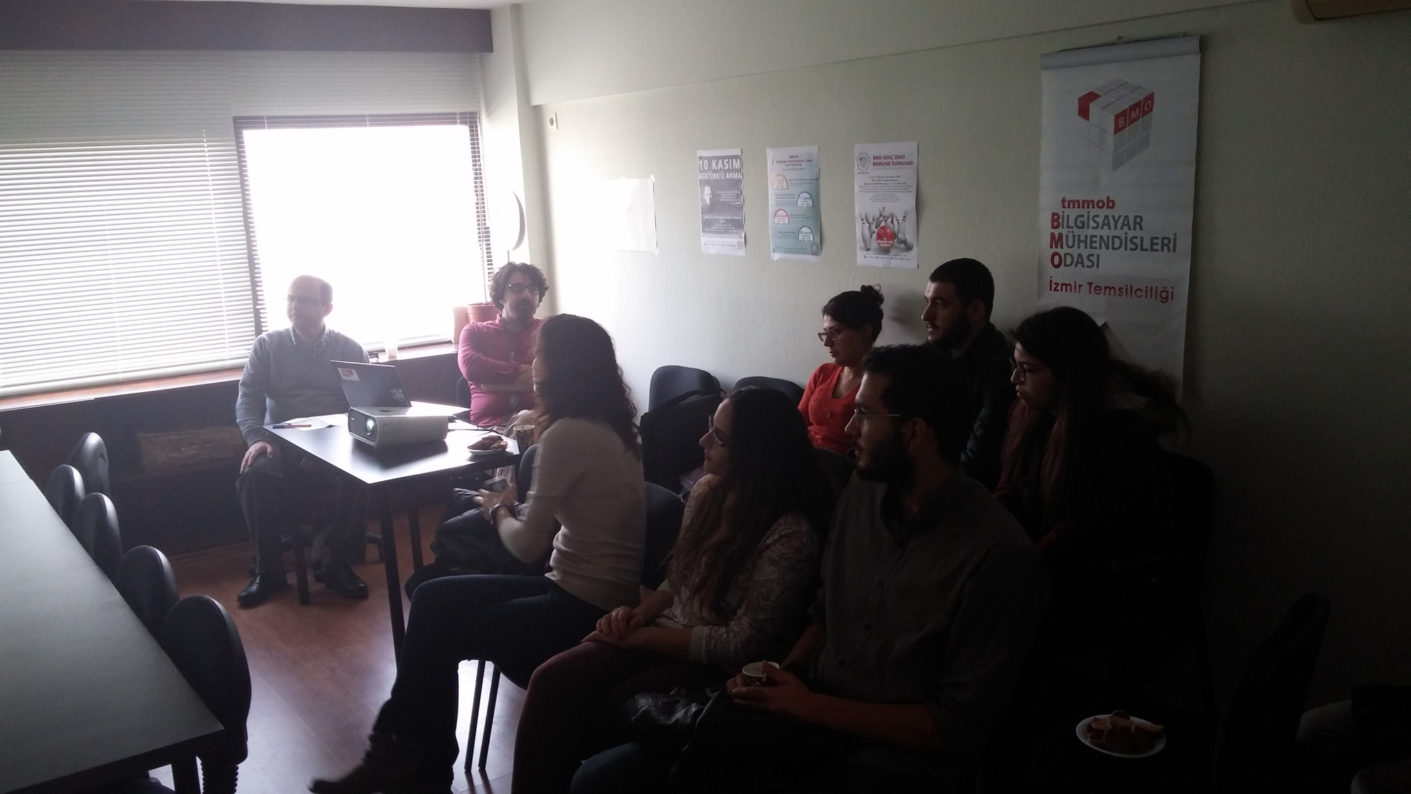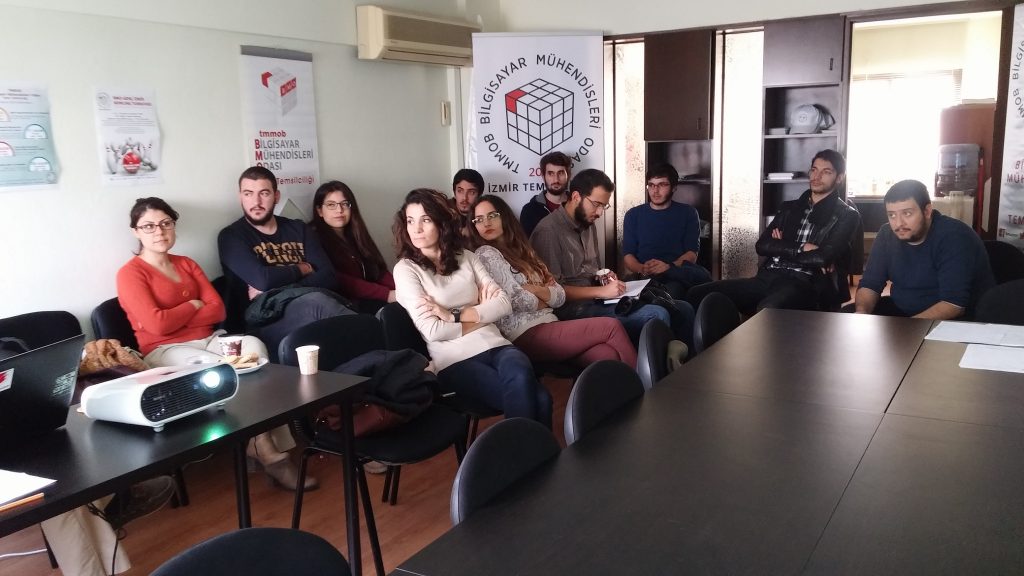Bilgisayar Mühendisleri Odası İzmir Temsilciliği’nde 26 Kasım 2016 Cumartesi günü, Bilişim Alanı ve Çalışanları konulu söyleşi yapıldı. BMO üyeleri akademisyen İlker Kalaycı ile özel sektör çalışanı Barış Özel’in konuşmacı olduğu etkinliğe Celal Bayar Üniversitesi öğrencilerinin yoğun katılımı oldu.