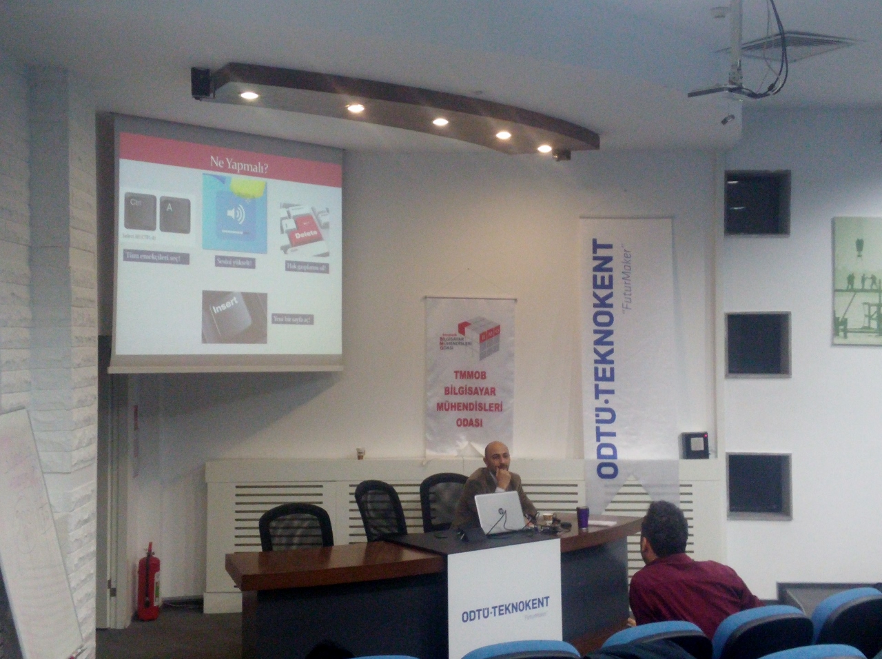 ODTÜ Teknokent içerisinde çalışan bilgisayar mühendislerinin çalışma yaşamına yönelik etkinlikler dizisinde “Meslek Hastalıkları”, “Bilişim Çalışanlarının Hukuki Hakları”, “Çalışma Yaşamında Güncel Gelişmeler” başlıkları altında İkizler Binası Toplantı salonunda toplamda üç seminer gerçekleştirildi.