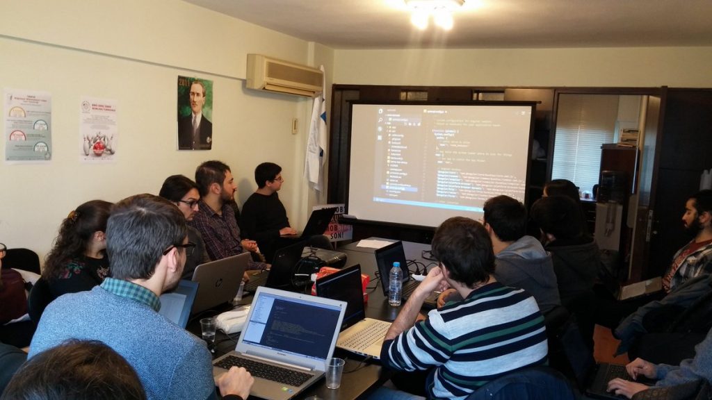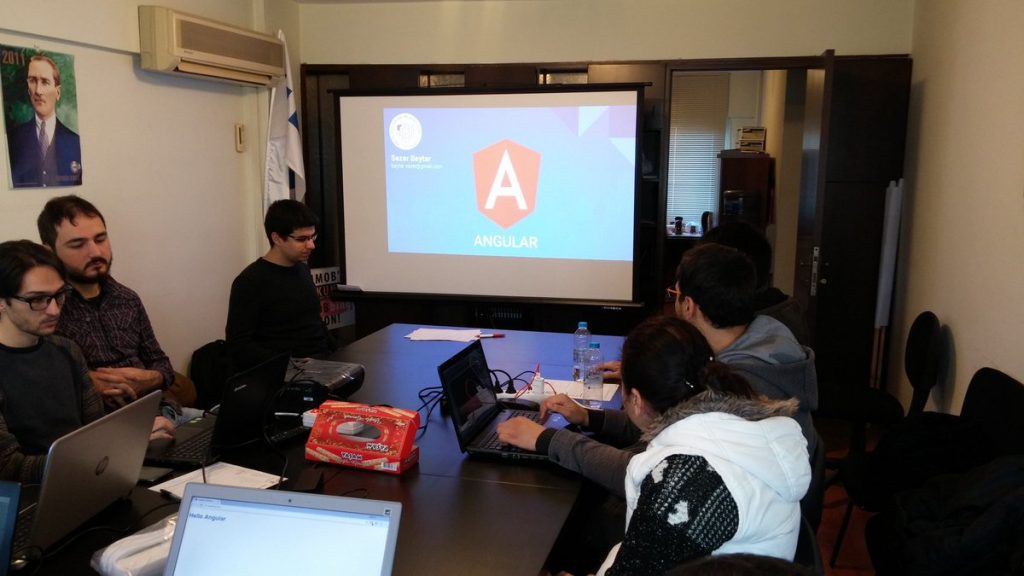 17 Aralık 2016 Cumartesi günü AngularJS önyüz uygulama geliştirme çatısını BMO İzmir Temsilciliği üyesi Sezer Baytar Temsilcilik’te üç saat süren eğitimde anlattı. Baytar çatının 1.0 sürümüne göre beş kat hızlı olduğunu söylediği 2.0 sürümünü temel alan anlatımında katılımcıların yanlarında getirdikleri bilgisayarlarına gerekli kurulumları yaptıktan sonra “Hello Angular” uygulaması değiştirip geliştirilerek adım adım ilerlenmesini sağladı.