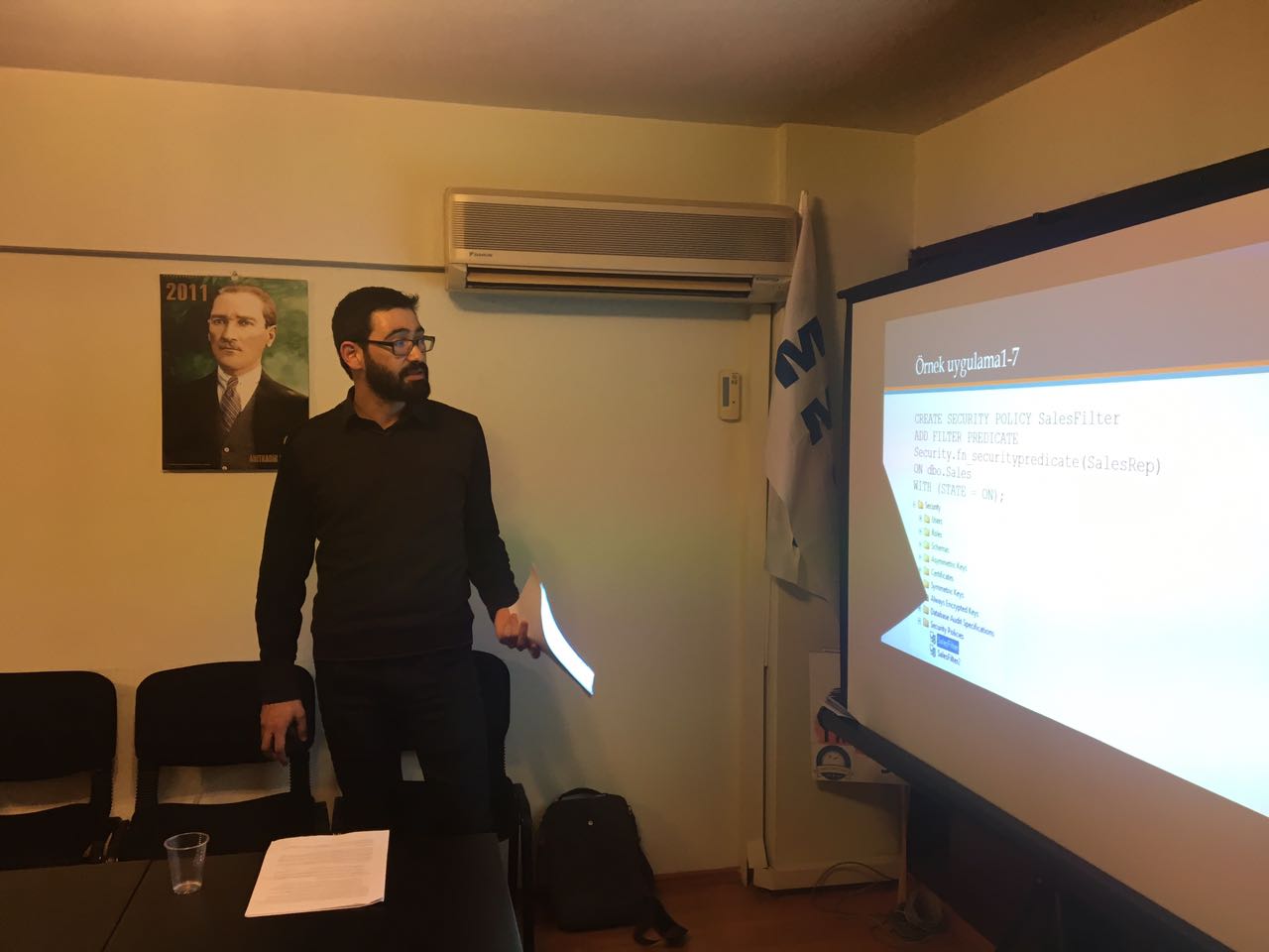 Bilgisayar Mühendisleri Odası İzmir Temsilciliği’nde 14 Aralık 2016 Çarşamba günü üyemiz Oktay Yıldırım, İlişkisel Veritabanlarında Gizlilik ve Güvenlik konulu bir buçuk saat süren bir eğitim verdi. Genç üyelerimizin yoğun ilgi gösterdiği eğitimde Yıldırım, MSSQL veritabanı örnekleriyle kullanıcı giriş kontrolü ve yetkilendirmesi altyapısını açıkladı. Özellikle Row Level Security (Satır Düzeyi Güvenlik) kavramını ayrıntılı örneklerle açıkladı. Bu yapıya neden ihtiyaç duyulduğunu, satır düzeyi güvenliğin veritabanı bütünlüğünü sağlamada getirdiği avantajları, diğer yöntemlere göre neden daha performanslı olduğunu da açıkladı. Farklı ihtiyaçlara göre her uygulamanın bir güvenlik modeli olması, kullanıcı sayısından, kullanıcı çeşitliliğini ve verinin hassasiyetine göre uygun modelin seçilmesi gerektiğini vurguladı.