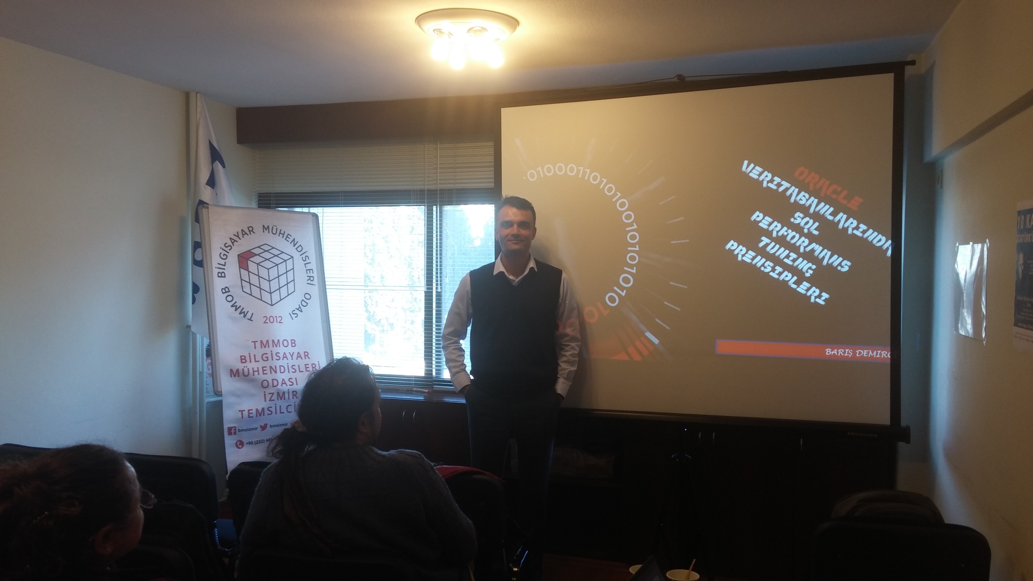 Bilgisayar Mühendisleri Odası İzmir Temsilciliği’nde 28 Ocak Cumartesi günü Barış Demirci SQL ve Performans Tuning eğitimi verdi. 11 yıl veritabanı sistem yöneticiliği, 6 yıl veritabanı uygulama geliştiriciliği deneyimi olan Demirci, temel prensipleri ve en karmaşık performans sorunlarının çözüm yöntemlerini basit bir dil ve anlaşır örneklerle açıkladı.
