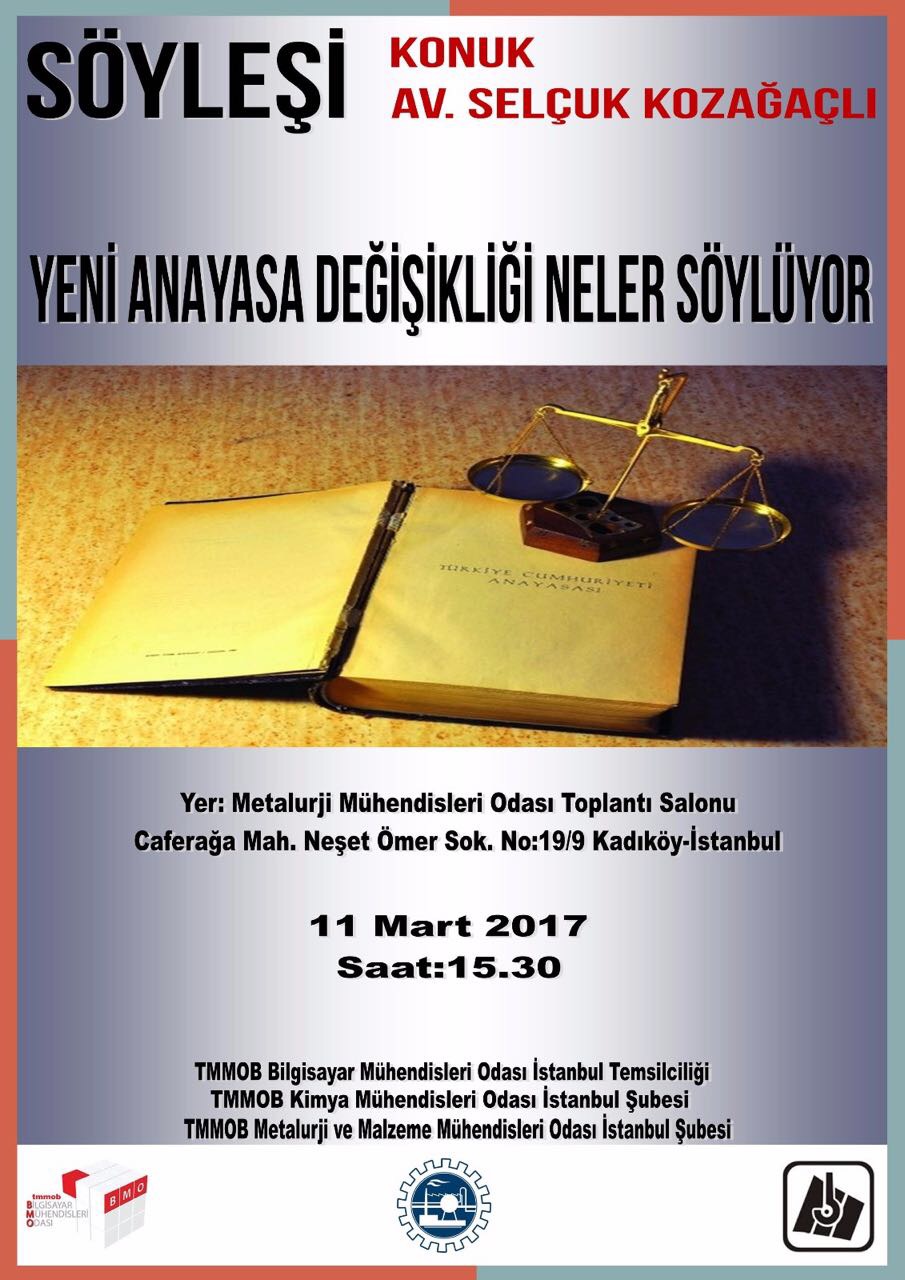 11 Mart 2017 Cumartesi günü Metalurji Mühendisleri Odası Toplantı Salonunda, Bilgisayar Mühendisleri Odası İstanbul Temsilciliği, Kimya Mühendisleri Odası İstanbul Şubesi ve Metalurji ve Malzeme Mühendisleri Odası İstanbul Şubesi ortaklığında Av. Selçuk Kozağaçlı`nın katılımıyla “Yeni Anayasa Değişikliği Neler Söylüyor” konulu söyleşi düzenlenecektir.
