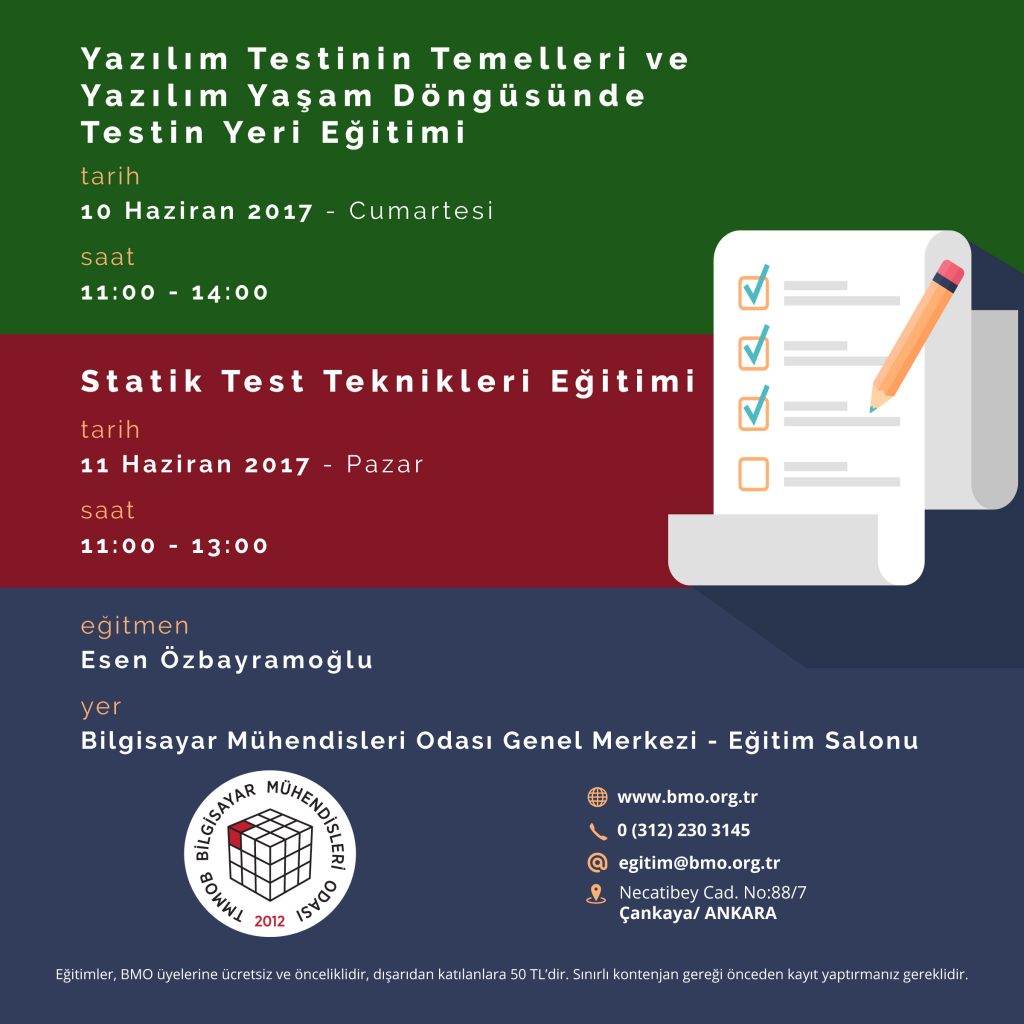 Bilgisayar Mühendisleri Odası Eğitim Komisyonu tarafından hazırlanan eğitimler devam ediyor. Yazılım Testi eğitimleri olarak toplam iki hafta sürecek eğitimlerin ilk bölümü açıklandı.