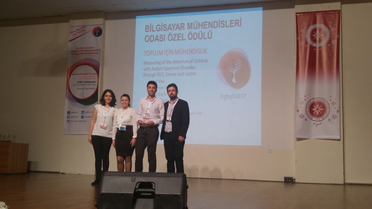 “Measuring Attention of Children with Autism Spectrum Disorder through EEG, Sensor and Games” Proje Özeti: EEG cihazı, Sanal Gerçeklik Gözlüğü,Mobil Oyun ve Raspberry Pi’dan oluşan sistem,senkronize bir şekilde çalışmaktadır.EEG cihazı ve Sanal Gerçeklik Gözlüğü çocuğa takıldıktan sonra , Raspberry Pi ile EEG verileri ve Oyun içindeki aktiviteler takip edilmektedir.Oyun içerisinde bir tren ile seyehat eden çocuk,çevredeki nesneleri incelerken , o anda ki alfa-beta dalgalarının takibi ile nelere dikkat ettiği kayıt altına alınır.Maksimum dikkat süresi de bu şekilde ortaya çıkartılır.Bu testler düzenli aralıklarla yapılarak çocukta ki dikkat süresi artışı veya azalışı düzenli olarak takip edilebilir.Bu sistem ile,Otizmli çocuğun ilgi alanları ve ilgi duyduğu nesneler ortaya çıkartılabilir.Bu sayede çocuğa özel eğitim içeriği oluşturulabilir.Çocuğun dikkatini verdiği nesnelerin kullanıldığı bir eğitim ortamında,öğrenme süresi kısalır ve eğitim verimli hale gelir.Bu projenin geliştirilme aşamasında bir çok eğitim merkezi ve öğretmeni ile ortak çalışılmıştır ve bir akademik araştırma çalışması sürmektedir.
