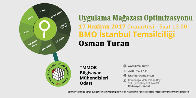 17 Haziran 2017 Cumartesi günü saat 13.00′de Bilgisayar Mühendisleri Odası İstanbul Temsilciliği’nde Uygulama Mağazası Optimizasyonu eğitimi düzenlenecektir.