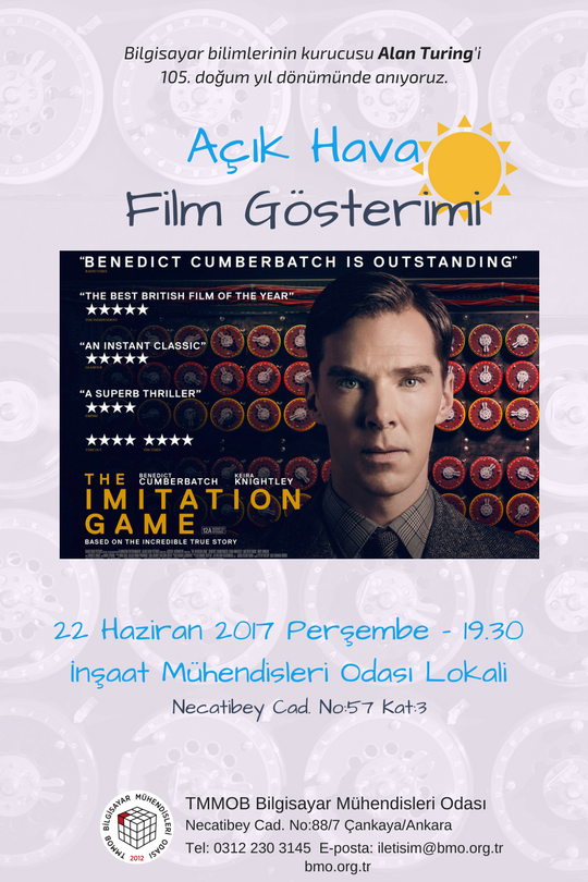 Bilgisayar biliminin kurucusu sayılan, İngiliz matematikçi ve kriptolog Alan Turing’i 105. doğum gününde, Turing’in hayatını anlatan “The Imitation Game” film gösterimi ile anıyoruz. Gösterim 22 Haziran 2017 Perşembe akşamı 19.30’da İnşaat Mühendisleri Odası Lokali’nde (Necatibey Cad. No:57 Kat:3 Ankara), açık havada, ücretsiz gerçekleştirilecektir.
