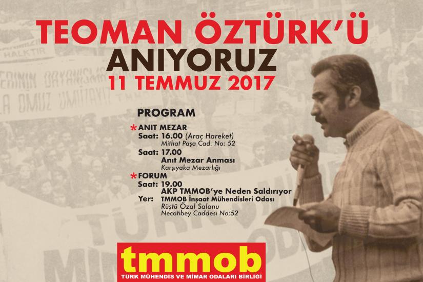 TMMOB’nin bugünkü toplumcu çizgisinin yaratıcılarından, 1973-1980 dönemi TMMOB Başkanı Teoman Öztürk ölümünün 23. yılında (11 Temmuz 2017) Karşıyaka’daki anıt mezarı başında ve İMO’da düzenlenecek forumla anılacak. Mezar başında gerçekleştirilecek anma için saat 16.00’da Mithatpaşa Cad. No:52’den araç kaldırılacak.