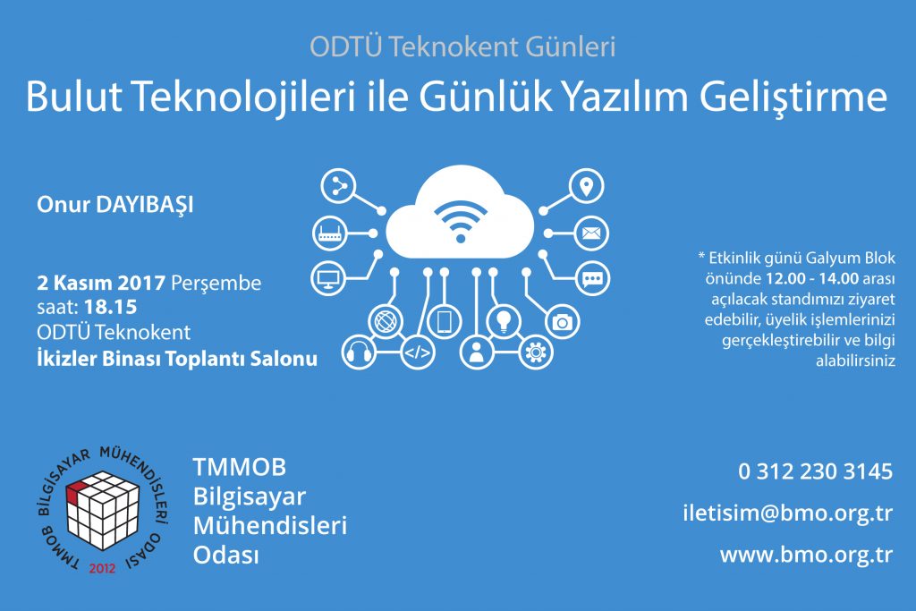 Bilgisayar Mühendisleri Odası Teknoket çalışmaları kapsamında düzenlenen ODTÜ Teknokent Günleri, 2 Kasım perşembe günü saat 18.15’te Onur DAYIBAŞI’nın bulut teknolojileri sunumu ile devam ediyor.