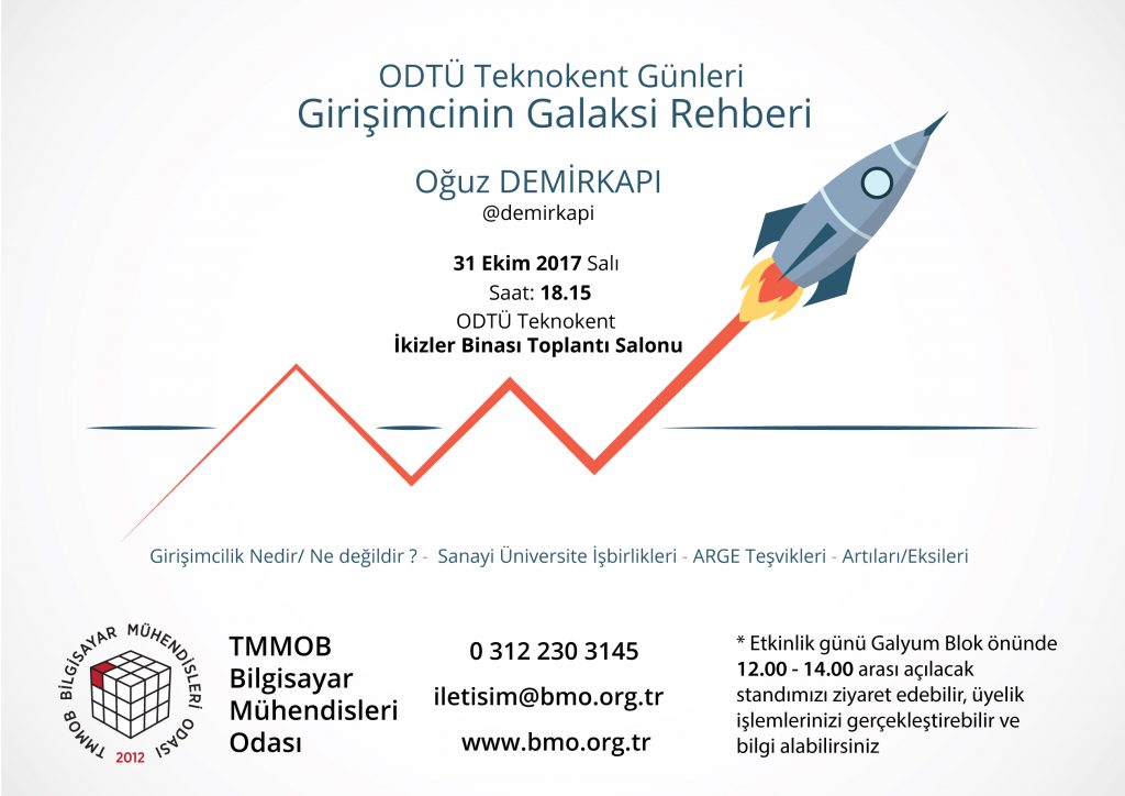 Bilgisayar Mühendisleri Odası Teknoket çalışmaları kapsamında düzenlenen ODTÜ Teknokent Günleri, 31 Ekim salı günü saat 18.15’te Oğuz DEMİRKAPI’nın girişimclik sunumu ile devam ediyor.