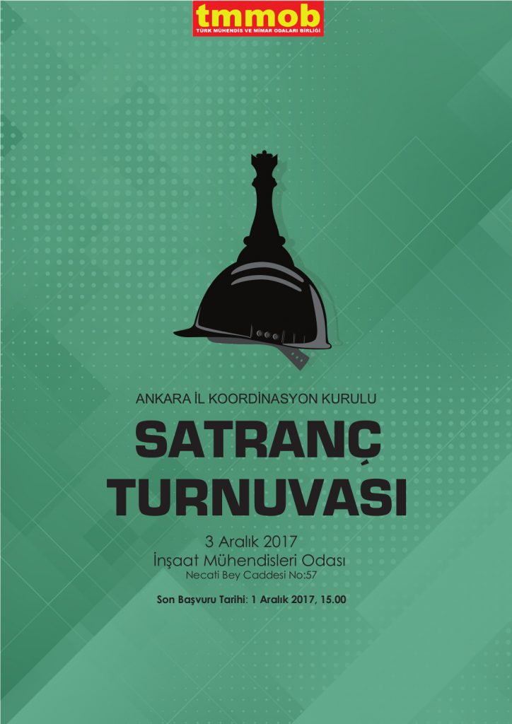 TMMOB Ankara İl Koordinasyon Kurulu, 3 Aralık 2017 Pazar günü satranç turnuvası düzenliyor. Turnuvaya, TMMOB’ye bağlı odaların üyeleri katılabilecek. Katılım için son başvuru tarihi, 1 Aralık 2017 Cuma, saat 15:00.