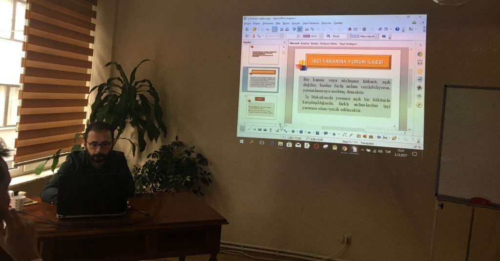 Toplantının ikinci bölümünde iş hukuku konusunda Avukat Görgün Danacı tarafından yapılan sunum ile üyelerimize hakları ve haklarını nasıl aramaları gerektiği konusunda bilgi verildi. Görgün Danacı sunumu ile iş sözleşmeleri, işçi hakları, fesih nedenleri başta olmak üzere bir çok konuda detaylı bilgi aktardı. Sunum katılımcıların soruları ile devam etti. Toplantı sonunda oda olarak yapılabilecekler konusunda mini bir forum gerçekleştirildi.