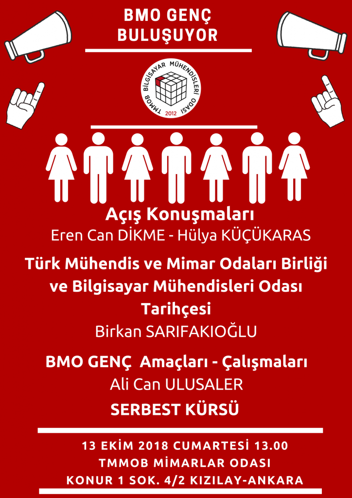 BMO Genç üyelerinin ve üniversitelerimizin bilgisayar, bilgisayar bilimleri, bilgisayar ve enformatik, bilgisayar sistemleri, bilgisayar ve kontrol, yazılım, bilişim sistemleri, yazılım ve bilişim mühendisliği bölümlerinden öğrencilerin katılımına açık olan BMO Genç Buluşması, 13 Ekim 2018 Cumartesi günü saat 13.00’te Ankara’da TMMOB Mimarlar Odasının salonunda düzenlenecek.