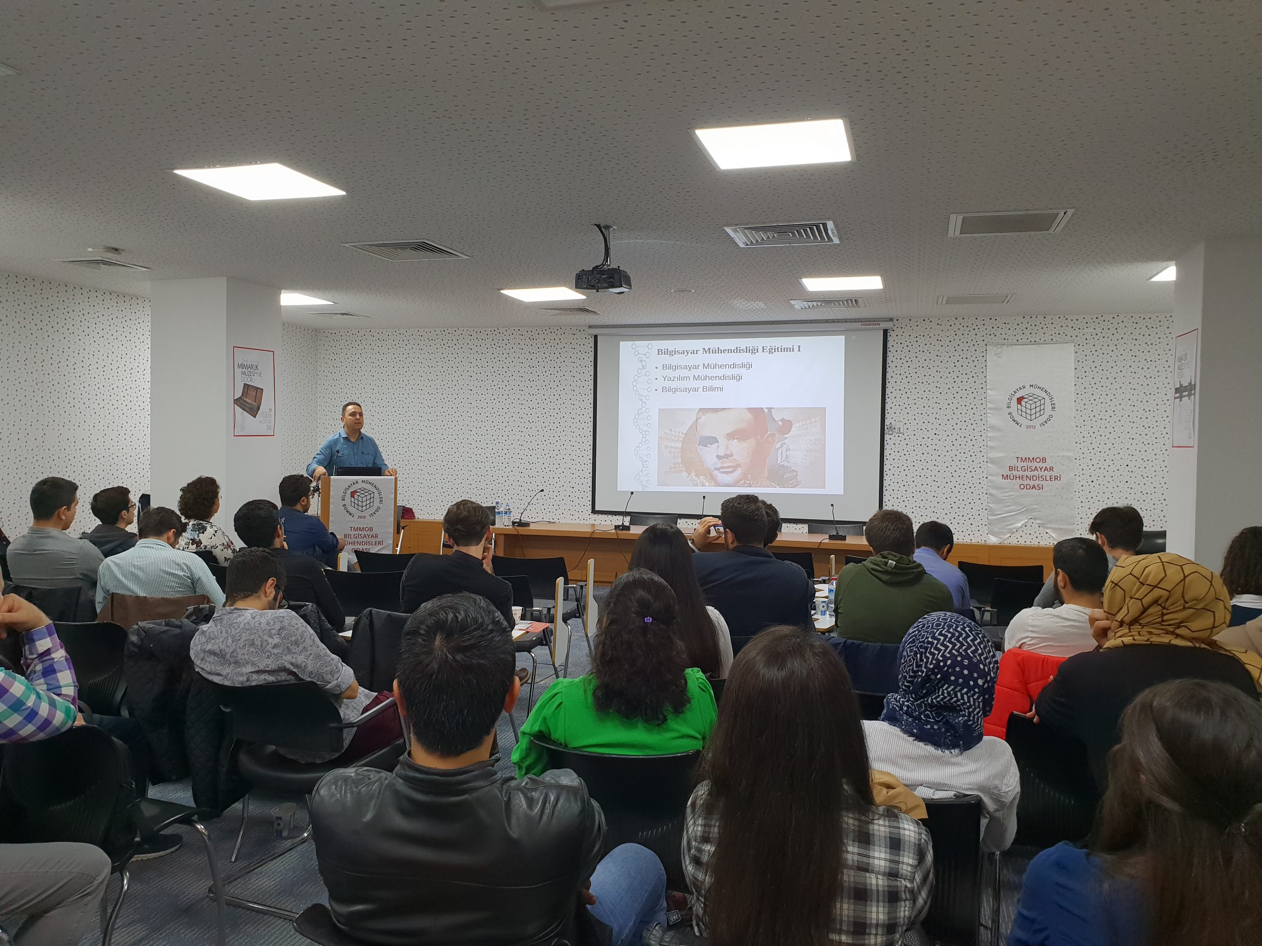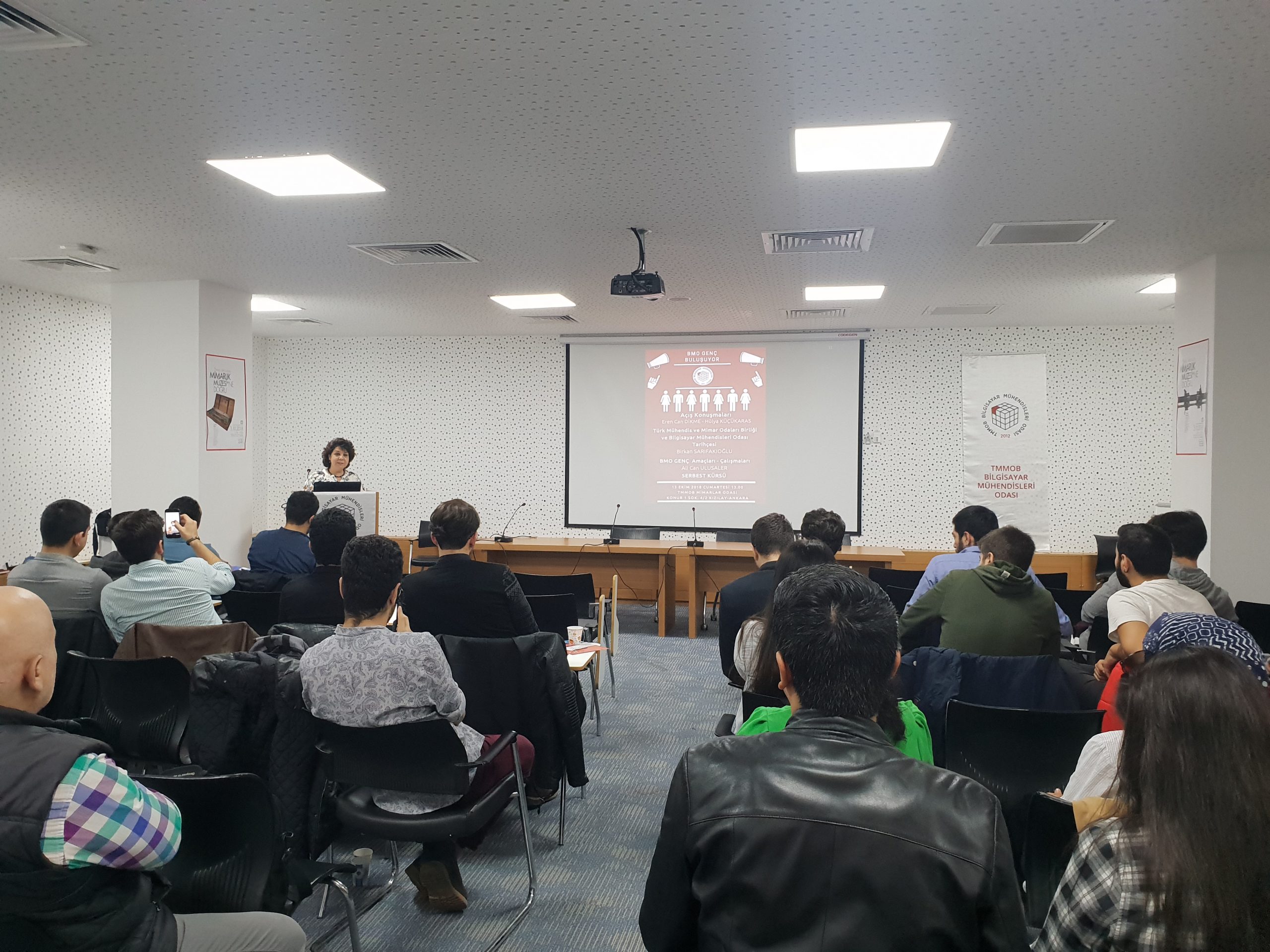 Etkinliğin açış konuşmalarını yapan BMO İstanbul İl Temsilciliği Öğrenci Üye Komisyonu Başkanı Eren Can DİKME ile Bilgisayar Mühendisleri Odası Yönetim Kurulu Başkanı Hülya KÜÇÜKARAS, BMO’nun ilkelerinden ve bu çatı altında örgütlenmenin öneminden söz ederek sorunların tanımlanması ve çözülmesinin ancak dayanışmamızla olanaklı olacağını vurguladılar.