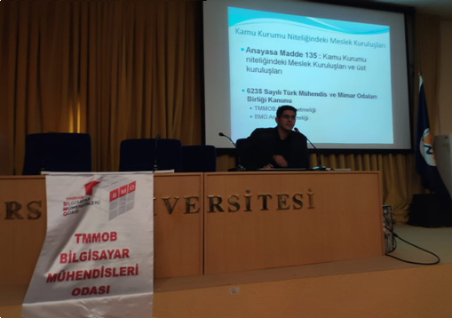 Mersin Üniversitesi Bilgisayar Mühendisliği Siber Güvenlik Topluluğunun düzenlediği “BMO Tanıtımı”nda temsilcimiz Fuat YELKEN meslek örgütleri, Türk Mühendis ve Mimar Odaları Birliği ve Bilgisayar Mühendisleri Odası hakkında bilgi vererek, Bilgisayar Mühendisleri Odasına üye olmanın önemine değindi; Odanın kurumsal İnternet sitesinde 29 Eylül 2018’de yayımlanan “Bilgisayar Mühendisliği Öğrencileri Aramıza Hoş Geldiniz!” başlıklı yazıda yer alan “12 Altın Öğüt”e vurgu yaparak bölümün ve bilgisayar mühendisliği mesleğinin gençlere kazandıracağı yetkinliklerden söz etti.