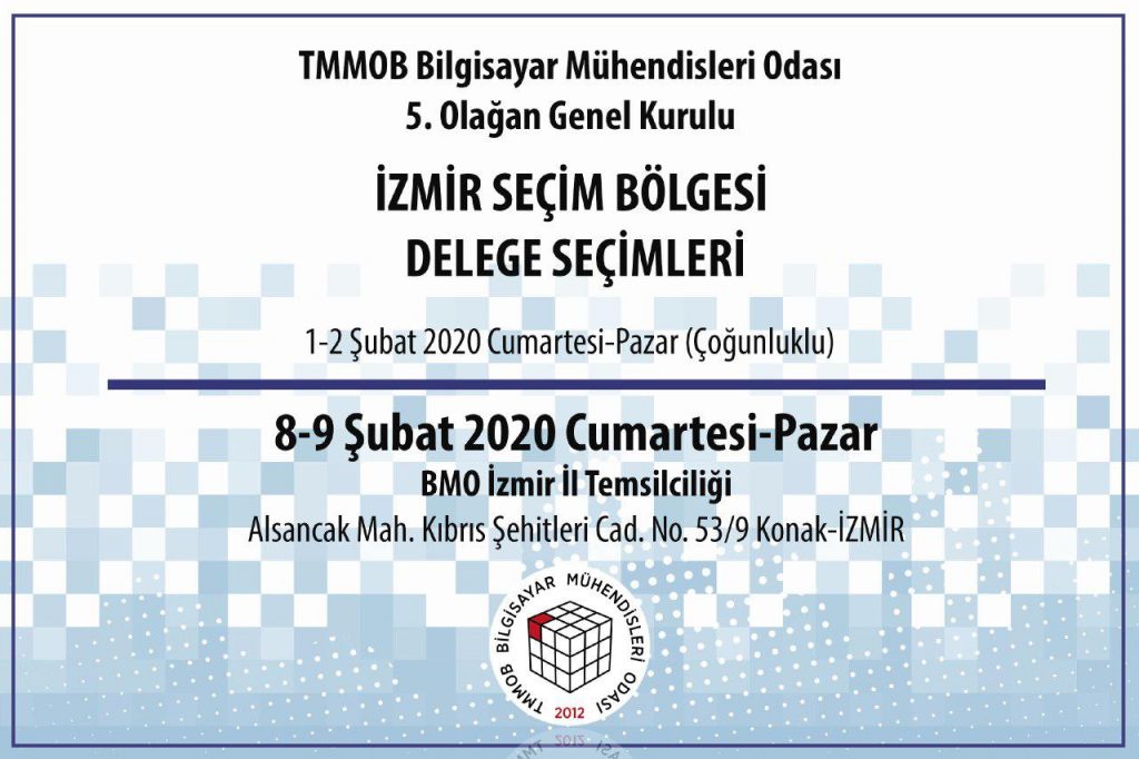 Mart 2020 içinde gerçekleştirilecek Bilgisayar Mühendisleri Odası 5. Olağan Genel Kuruluna katılacak İzmir Seçim Bölgesi delegelerini belirlemek amacıyla 1-2 Şubat 2020 Cumartesi-Pazar günleri aşağıdaki gündemle “BMO İzmir İl Temsilciliği Alsancak Mah. Kıbrıs Şehitleri Cad. No. 53/9 Konak-İZMİR” adresinde delege seçimleri yapılacaktır.