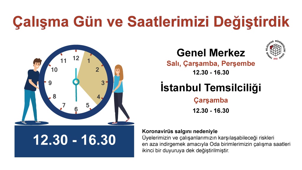 Üyelerimizin ve çalışanlarımızın koronavirüs salgınından kaynaklı risklerini en aza indirgemek amacıyla çalışma saatlerimizi 6 Nisan 2020 Pazartesi gününden başlayarak değiştirdik. Özellikle İstanbul’daki koşullar göz önüne alınarak İstanbul Temsilciliğimizin haftada 1 gün açık olması kararlaştırılmıştır.