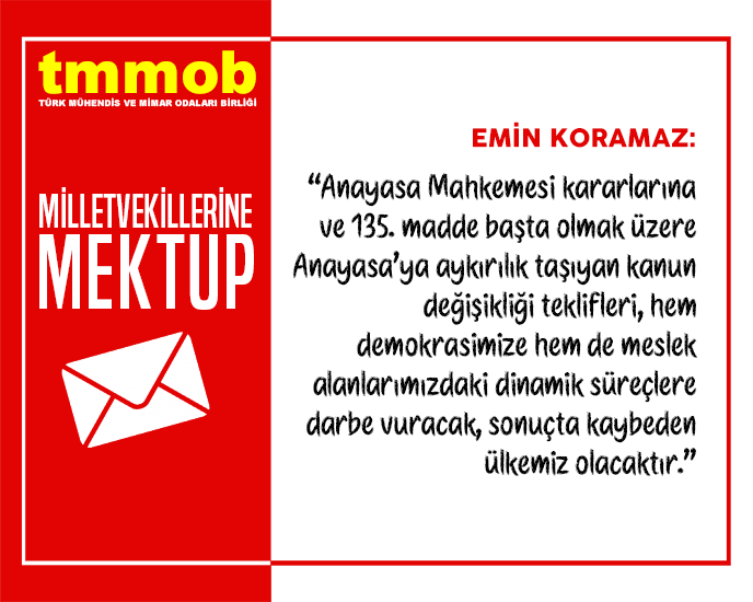 Türkiye Büyük Millet Meclisi gündemine getirilmesi beklenen “meslek kuruluşları yasalarının değiştirilmesi” yönündeki teklifler konusunda 28 Mayıs 2020’de TMMOB Yönetim Kurulu Başkanı Emin KORAMAZ tarafından tüm milletvekillerine bir mektup gönderilerek konuya ilişkin görüşümüz aktarıldı.