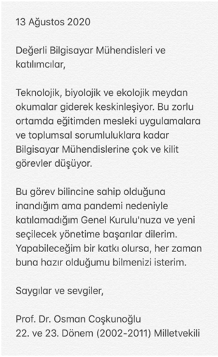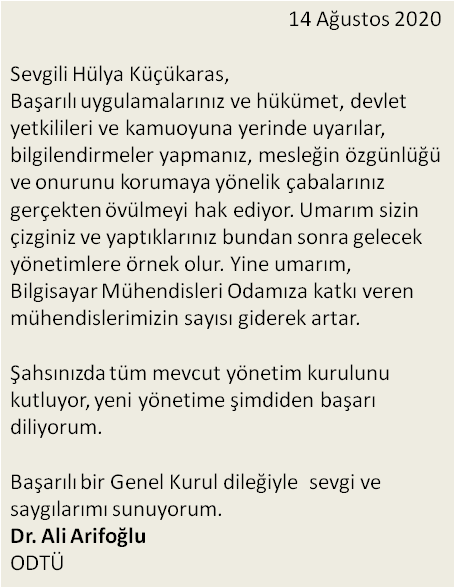 Genel kurulumuza katılarak yanımızda olan Oda başkanlarına, kitle örgütlerinin temsilcilerine, başarı dileklerini gönderen Dr. Ali ARİFOĞLU (ODTÜ), Prof. Dr. Ali YAZICI (Atılım Üni.), Doç. Dr. Attila ÖZGİT (ODTÜ), Prof. Dr. Aydın KÖKSAL (Hacettepe Üni.), Prof. Dr. Cem BOZŞAHİN (ODTÜ), Prof. Dr. Cem SAY (Boğaziçi Üni.), Prof. Dr. Cesur BARANSEL (Gaziantep Üni.), Doç. Dr. Ersay GÜRSOY (Hacettepe Üni.), Prof. Dr. Ersin TÖRECİ (Hacettepe Üni.), Prof. Dr. Ebru AKÇAPINAR SEZER (Hacettepe Üni.), Prof. Dr. Eşref ADALI (İTÜ), Prof. Dr. Fatoş YARMAN VURAL (ODTÜ), Füsun SARP NEBİL (turk-internet.com), Prof. Dr. Gülsün TÖRECİ (Hacettepe Üni.), Prof. Dr. Halit OĞUZTÜZÜN (ODTÜ), Halil TEBER (TELKODER Başkanı), Mehmet AKSAYAN (Hacettepe ve Yeditepe Üni.), Prof. Dr. Murat TAYLI (Hacettepe ve Kültür Üni.), Prof. Dr. Osman COŞKUNOĞLU, Rüştü ARSEVEN ve Fırat GÜR (TÜBİDER), Prof. Dr. Tolga ÇAPIN (TED Üni.), Turhan ÇAKAR (Tüketici Hakları Derneği), Mv. Utku ÇAKIRÖZER (BMO Üyesi, Eskişehir Milletvekili), Prof. Dr. Ümit KARAKAŞ (Hacettepe Üni.), Prof. Dr. Yahya KARSLIGİL (YTÜ) ve Prof. Dr. Ziya AKTAŞ’a (Başkent Üni.) dönem boyunca Odamıza verdikleri destek ve ilgileri için candan teşekkürlerimizi sunarız.