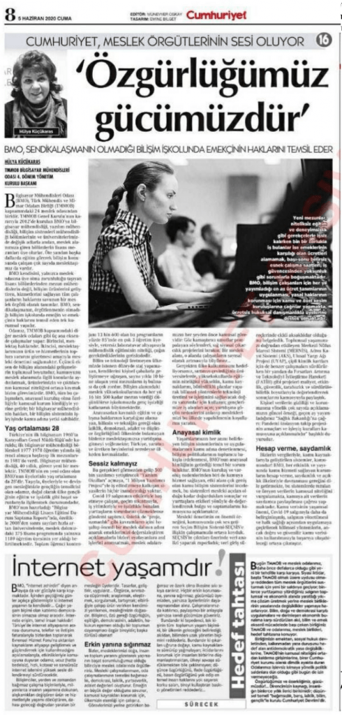 Cumhuriyet gazetesi, meslek odalarının yasalarında değişikliğe yol açacak yasa tasarısı çalışmalarının gündeme gelmesi üzerine “Cumhuriyet, Meslek Örgütlerinin Sesi Oluyor” başlıklı bir yazı dizisi başlattı. BMO Yönetim Kurulu Başkanı Hülya KÜÇÜKARAS’ın konuyla ilgili yazısı, 5 Haziran 2020 Cuma günü Cumhuriyet gazetesinde yayımlandı.