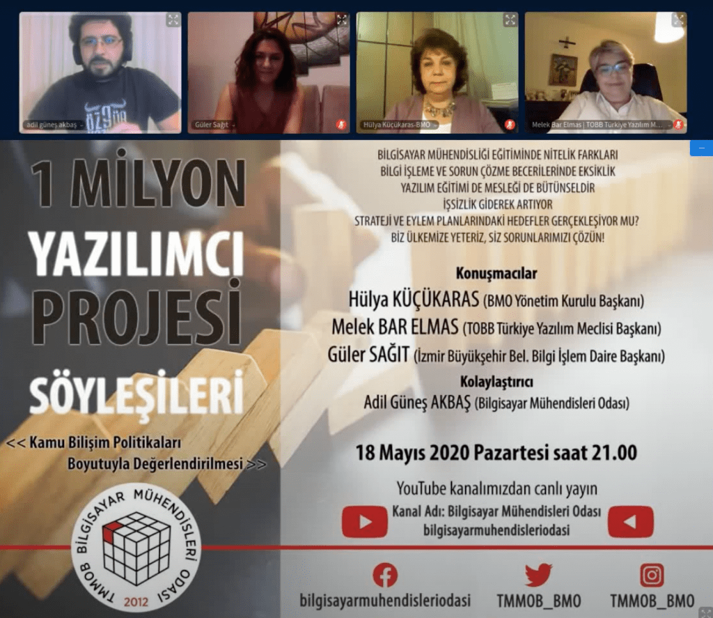 Açıklamanın ardından, BMO’nun YouTube kanalından canlı yayımlanan, meslektaşlarımızın ve öğretmenlerimizin katıldığı “1 Milyon Yazılımcı Projesi Söyleşileri” dizisiyle projeyi her yönüyle değerlendirdik. 27 Nisan 2020’deki ilk söyleşide, proje güncel sorunlar bağlamında değerlendirildi.