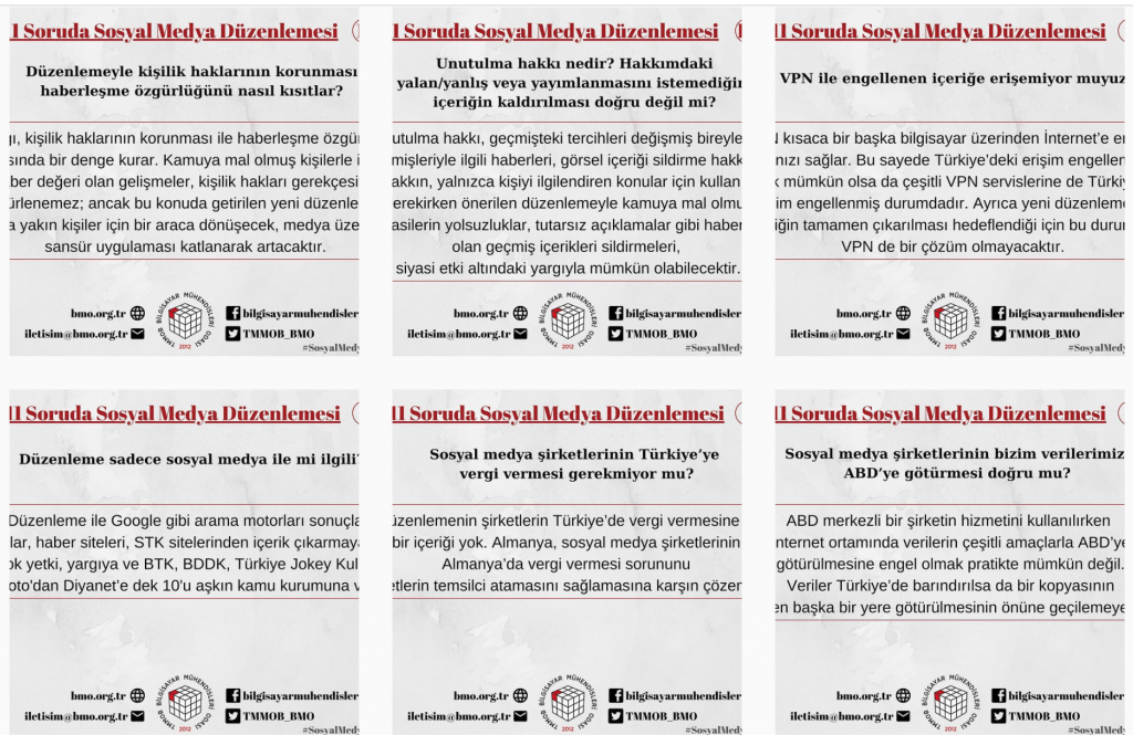 Kamuoyunda İnternet/Sosyal Medya Yasası olarak bilinen 5651 sayılı kanunda yapılması planlanan değişiklik, 29 Temmuz 2020’de TBMM tarafından kabul edildi. Öncesindeki süreçte Odamız konuyla ilgili kamuoyu oluşturmak adına çalışmalar yaptı. Bu kapsamda, 23 Temmuz 2020 tarihinde “Sosyal Medyaya Yeni Düzenleme: Görme, Duyma, Söyleme!” başlığıyla bir açıklama yayımladık, kanundaki değişiklikle ilgili bilgileri sosyal medya hesaplarımızdan kamuoyu ile paylaştık.