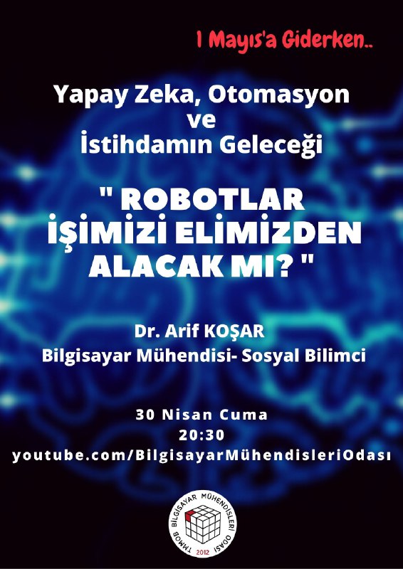 Üye İlişkileri ve Örgütlenme Komisyonumuzun düzenlediği “Robotlar İşimizi Elimizden Alacak Mı?” başlıklı çevrimiçi etkinlik, 30 Nisan 2021 Cuma akşamı saat 20:30’da Odamızın YouTube kanalında canlı olarak gerçekleşecek. Yapay zekâ, otomasyon ve istihdamın geleceğini üyemiz, bilgisayar mühendisi ve sosyal bilimci Dr. Arif Koşar ile konuşacağız. Etkinliğin kolaylaştırıcılığını ise Üye İlişkileri ve Örgütlenme Komisyonumuzdan Emine Aydın üstlenecek.