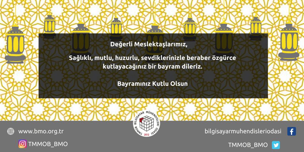 Bayramınız Kutlu Olsun 13/05/2021 BMO , DUYURULAR , GÜNCEL , HABERLER bayram , ramazan bayramı Değerli Meslektaşlarımız, Sağlıklı, mutlu, huzurlu, sevdiklerinizle beraber özgürce kutlayacağınız bir bayram dileriz. Bayramınız Kutlu Olsun. Bilgisayar Mühendisleri Odası 5. Dönem Yönetim Kurulu