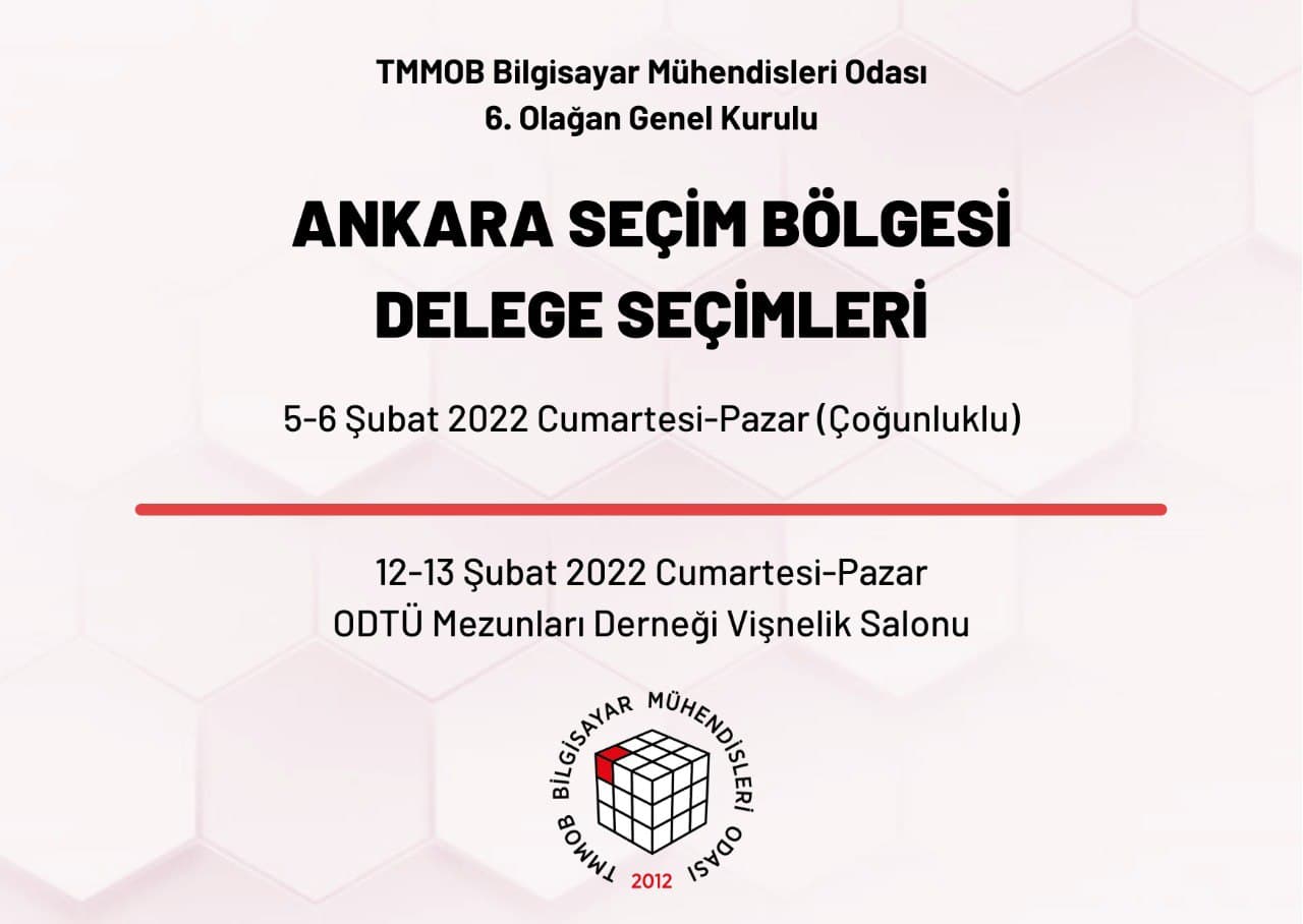 Mart 2022 içinde gerçekleştirilecek Bilgisayar Mühendisleri Odası 6. Olağan Genel Kuruluna katılacak Ankara Seçim Bölgesi delegelerini belirlemek amacıyla 5-6 Şubat 2022 Cumartesi-Pazar günleri aşağıdaki gündemle “BMO Genel Merkezi Necatibey Cad. No. 88/7 Kızılay-ANKARA” adresinde delege seçimleri yapılacaktır.