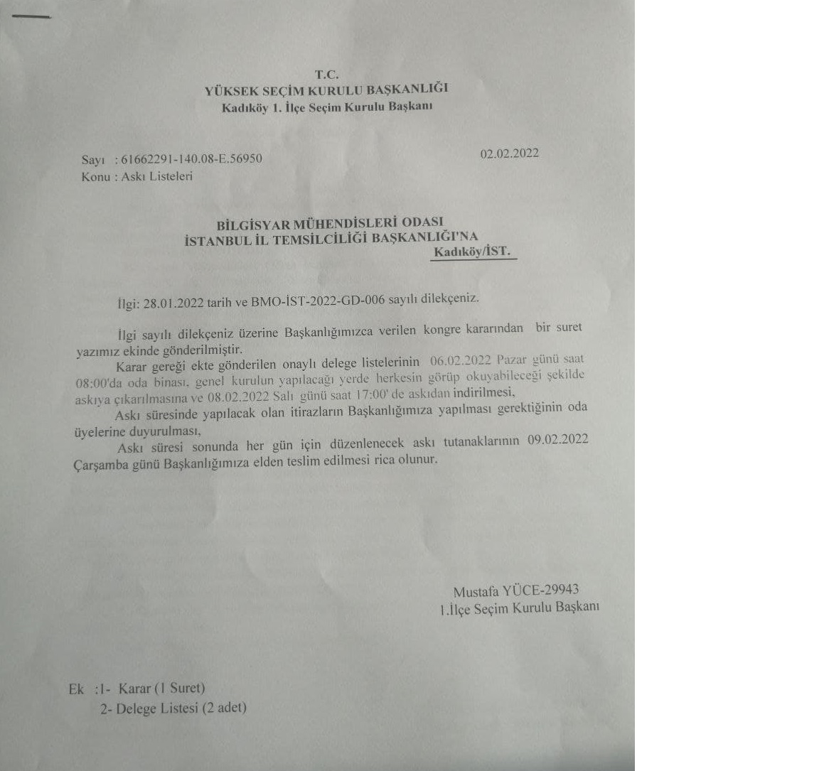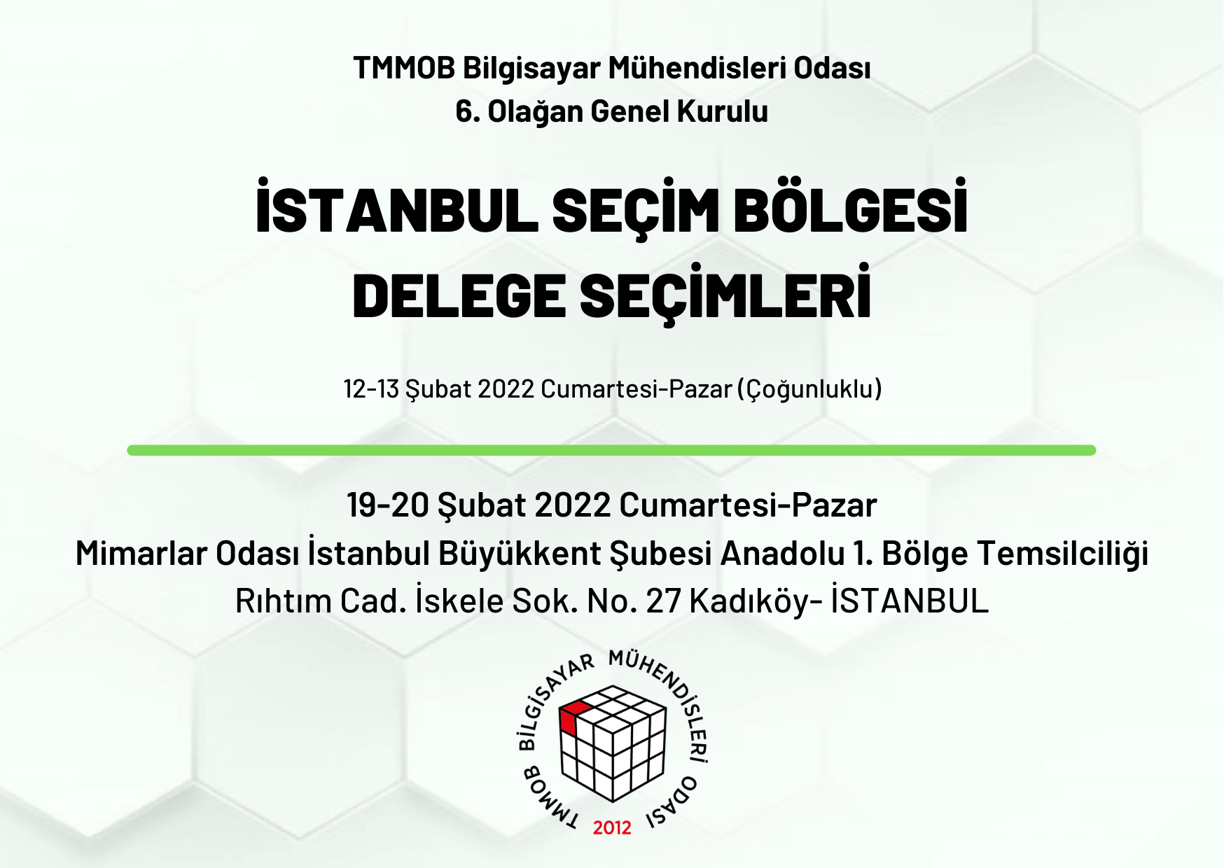 Mart 2022 içinde gerçekleştirilecek Bilgisayar Mühendisleri Odası 6. Olağan Genel Kuruluna katılacak  İstanbul Seçim Bölgesi  delegelerini belirlemek  amacıyla 12-13 Şubat 2022 Cumartesi-Pazar günleri aşağıdaki gündemle “BMO İstanbul İl Temsilciliği Osmanağa Mah. Serasker Cad. No. 35/3 Kadıköy–İSTANBUL” adresinde delege seçimleri yapılacaktır.