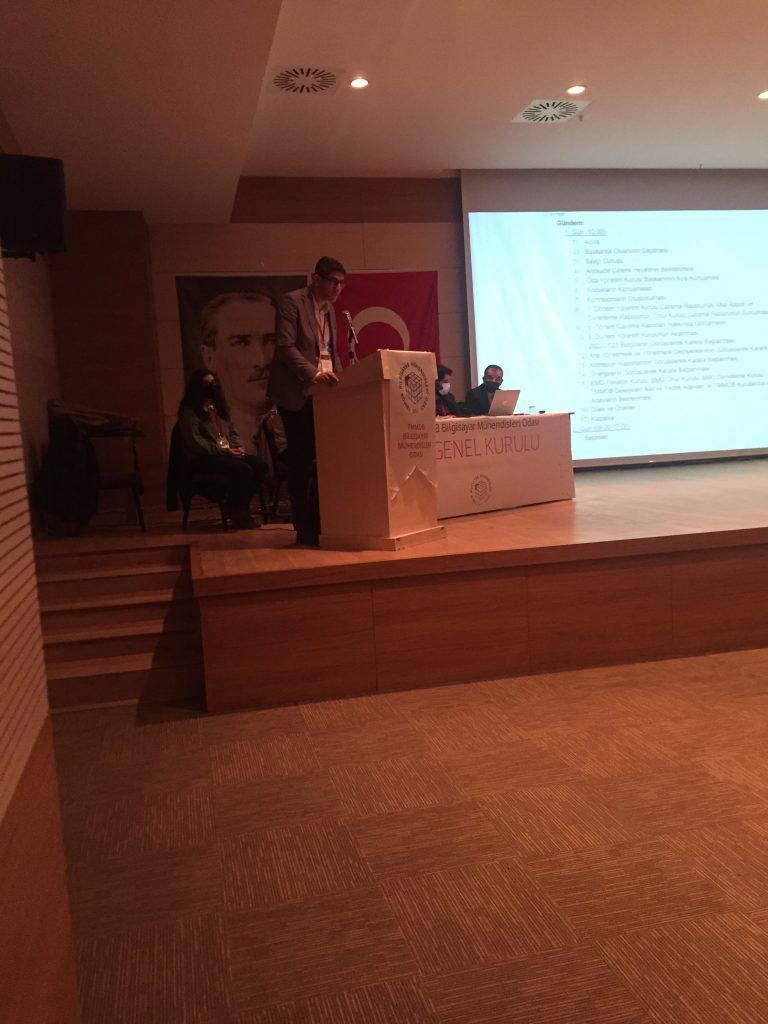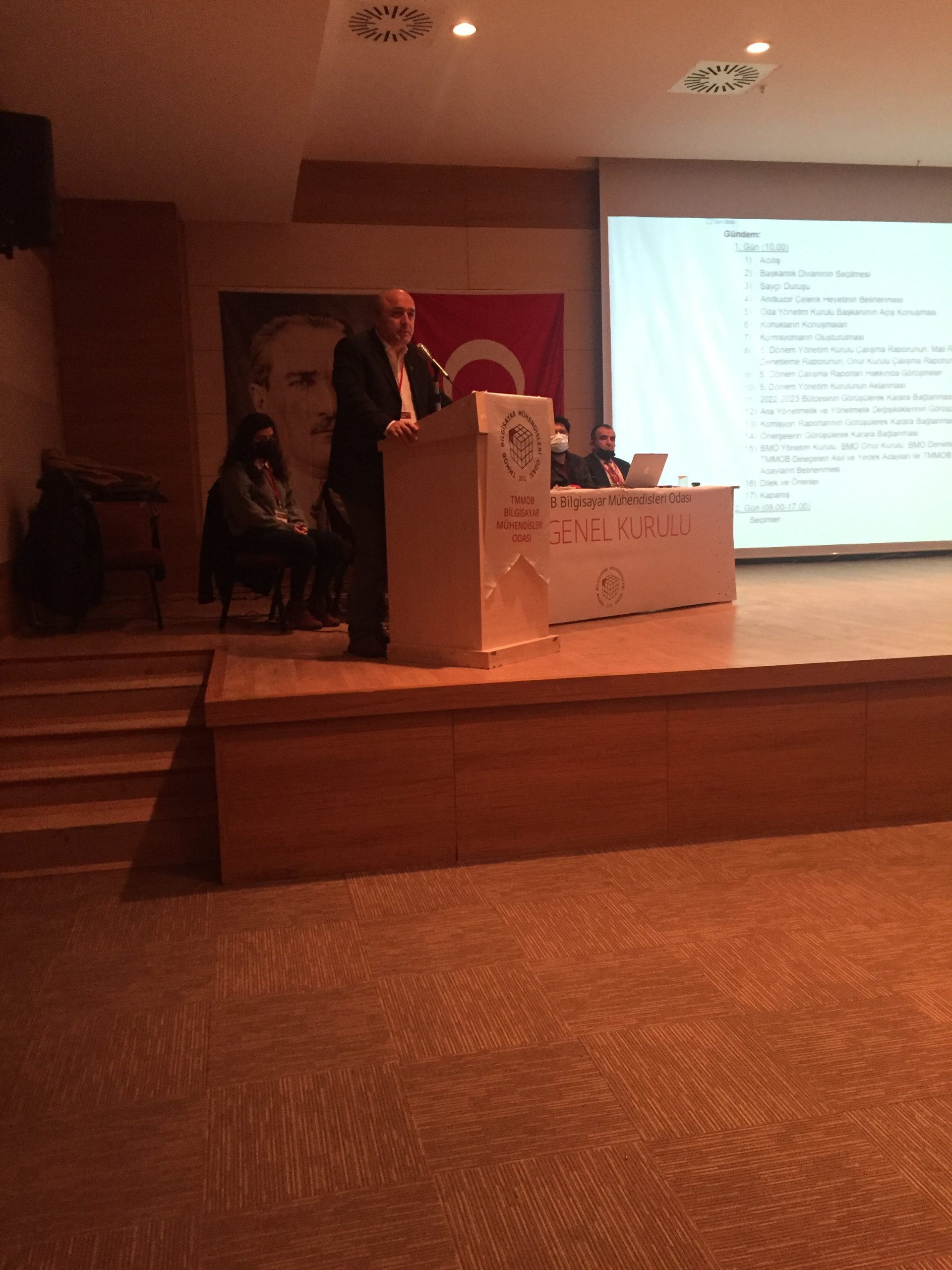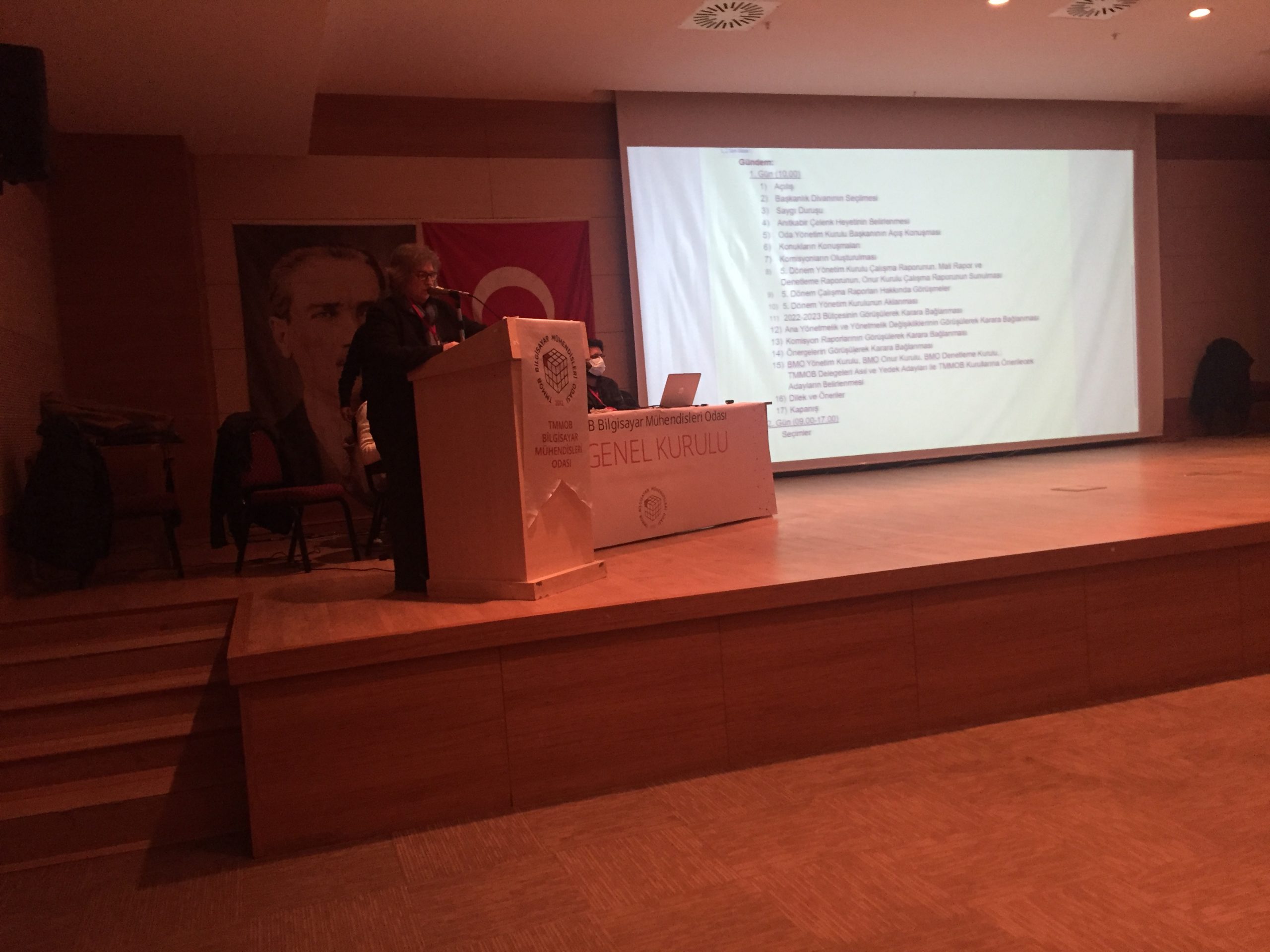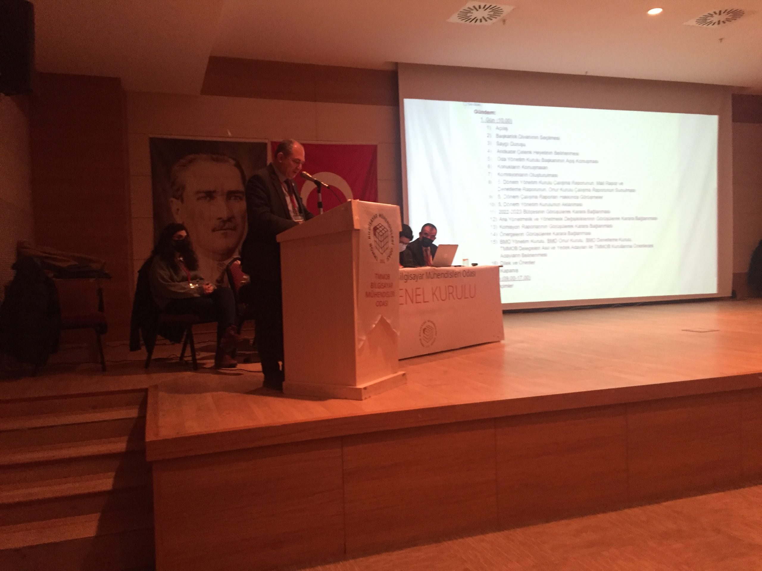 Kovid-19 salgını koşullarında, konuk ve delegelerimizin güvenli uzaklık ve sağlık önlemlerine gösterdikleri özenle başarıyla gerçekleştirilen genel kurulu, BMO 5. Dönem Yönetim Kurulu Başkanı Ali Rıza Atasoy açtı. Genel kurulumuzu, delegelerimizin oybirliğiyle seçilen Mutlu Payaslıoğlu (Başkan), Okan Öztürkmenoğlu (Başkan Yardımcısı) ve yazmanlar Hazal Kaya ile Seda Güner’den oluşan başkanlık divanı yönetti. BMO 5. Dönem Yönetim Kurulu Başkanı Ali Rıza Atasoy’un açış konuşmasıyla başlayan genel kurul, TMMOB Yönetim Kurulu Üyesi Cem Nuri Aldaş’ın konuşmasıyla sürdü.