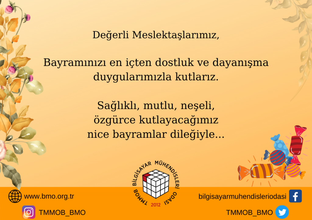 Bayramınız Kutlu Olsun 02/05/2022 BMO , DUYURULAR , GÜNCEL , HABERLER bayram Değerli Meslektaşlarımız, Bayramınızı en içten dostluk ve dayanışma duygularımızla kutlarız. Sağlıklı, mutlu, neşeli, özgürce kutlayacağımız nice bayramlar dileğiyle… Bilgisayar Mühendisleri Odası6. Dönem Yönetim Kurulu