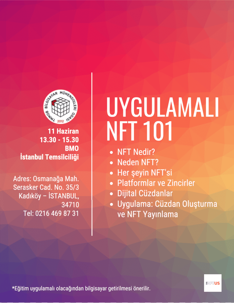 BMO İstanbul İl Temsilciliği olarak küresel salgın süresince, çevrimiçi eğitimlerimizin ardından, ilk yüz yüze eğitimimizi gerçekleştiriyoruz.  İlk yüz yüze eğitimimiz olan Uygulamalı NFT 101, 11 Haziran Cumartesi 13:30-15:30 saatleri arasında BMO İstanbul İl Temsilciliği’nde yapılacak.