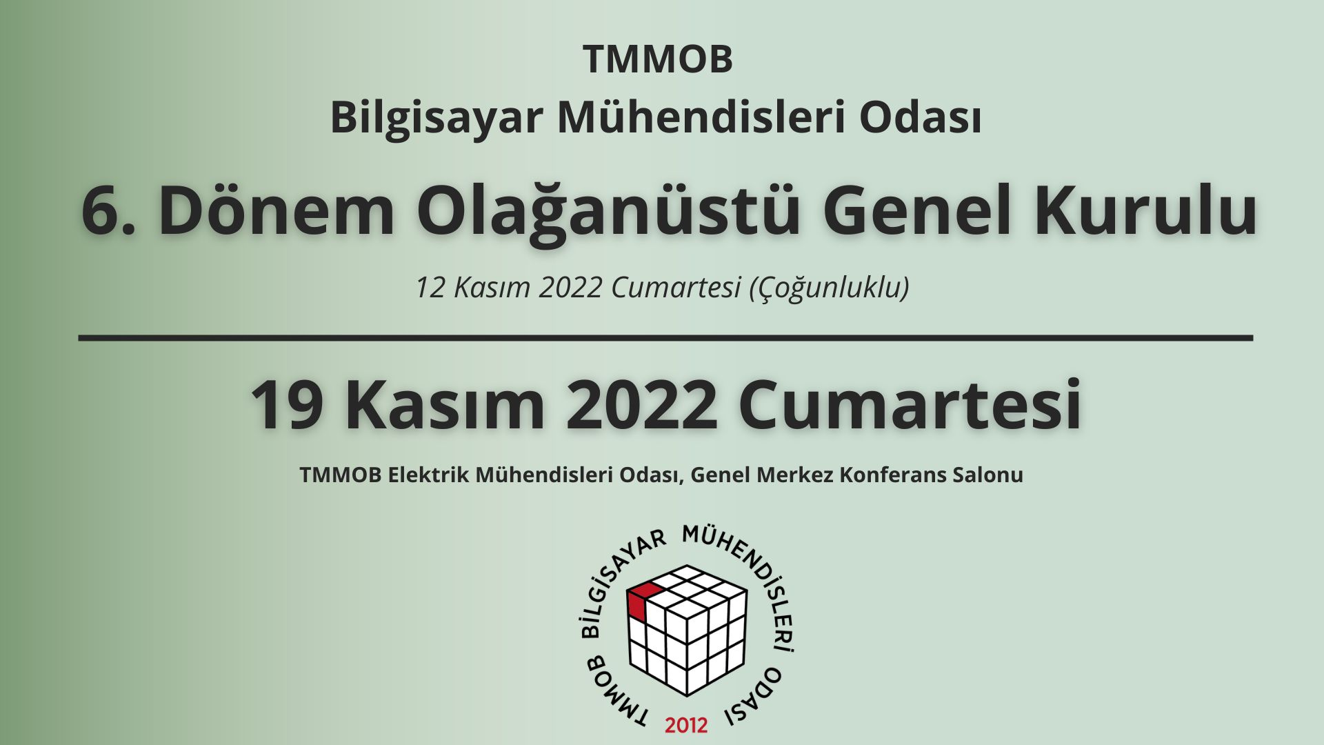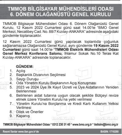 TMMOB Bilgisayar Mühendisleri Odası 6. Dönem Olağanüstü Genel Kurulu, 12 Kasım 2022 Cumartesi günü saat 14.00’te “BMO Genel Merkezi, Necatibey Cad. No. 88/7 Kızılay-ANKARA” adresinde aşağıdaki gündemle toplanacaktır.