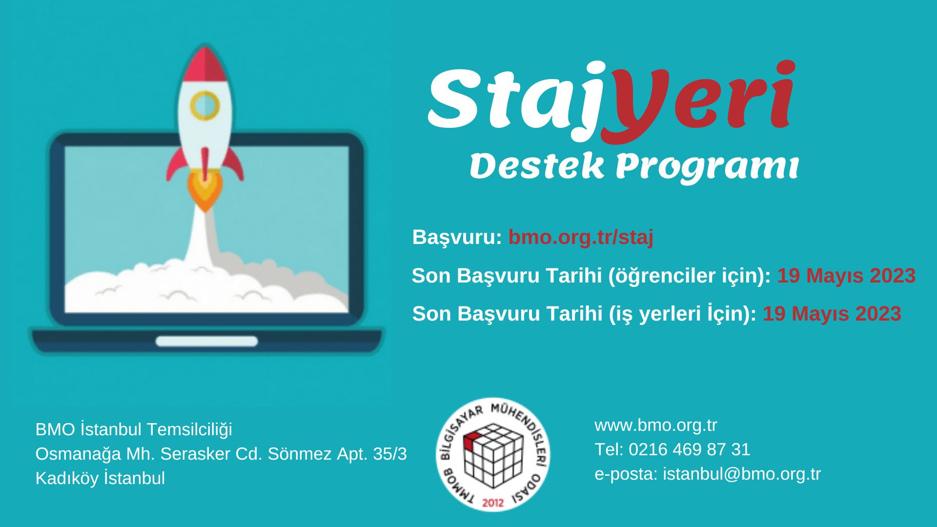 Bilgisayar Mühendisleri Odasının, BMO Ana Yönetmeliğinde tanımlı amaçlar ve 6. Dönem Çalışma Programı doğrultusunda uygulamayı sürdürdüğü “StajYeri Destek Programı”na 2023 yılı için başvurular başladı. Bu yıl koordinasyonu BMO İstanbul Temsilciliği tarafından yürütülen StajYeri Destek Programına başvurmak için son tarih 19 Mayıs 2023.