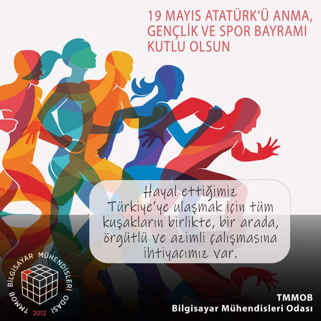 19 Mayıs 1919’da atılan ilk adımın ardından umutsuz ve zor günlerinden çıkmayı başarmış bir halkın aynı gücü ve iradeyi bugünler için de göstermesini sağlamalıyız. Hepimizin yaşamaktan mutluluk duyacağı bir ülkeye, hayal ettiğimiz Türkiye’ye ulaşmak için tüm kuşakların birlikte, bir arada, örgütlü ve azimli çalışmasına ihtiyacımız var. Bilgisayar Mühendisleri Odası olarak bugünlere ulaşmamızı sağlayan Gazi Mustafa Kemal Atatürk ve mücadele arkadaşlarını saygıyla anar, ulusumuzu ve geleceğimizi teslim edeceğimiz gençlerimizin 19 Mayıs Atatürk’ü Anma, Gençlik ve Spor Bayramını kutlarız.
