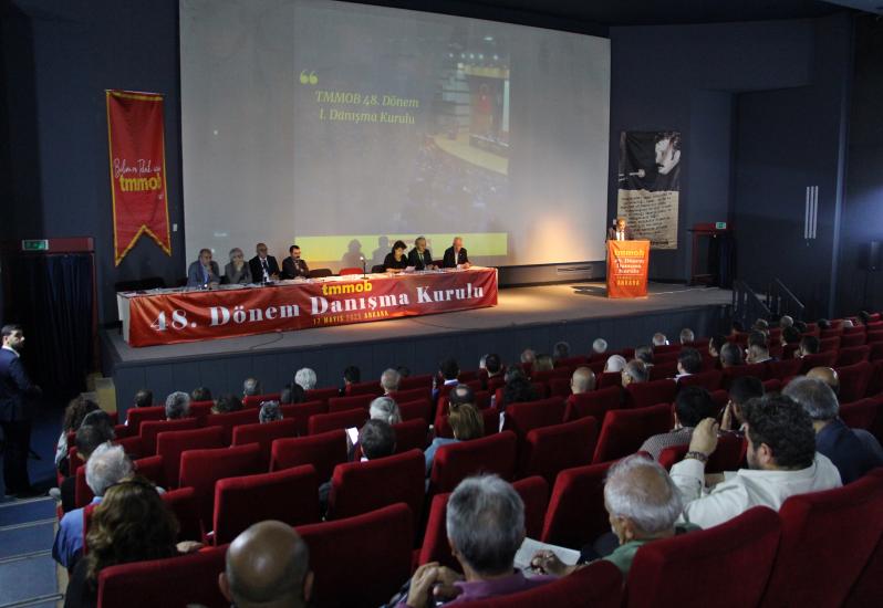 300’e yakın Danışma Kurulu Üyesi’nin katılımıyla gerçekleştirilen TMMOB 48. Dönem I. Danışma Kurulu Toplantısı, TMMOB Yönetim Kurulu Başkanı Emin KORAMAZ’ın açılış konuşması ile başladı. Ardından TMMOB Genel Sekreteri Özgür TOPÇU, TMMOB’nin Genel Kurul toplantısı sonrası çalışmaları konusunda bilgilendirme sunumunu gerçekleştirdi.