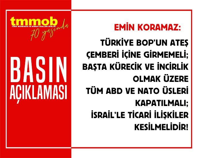 TMMOB Yönetim Kurulu Başkanı Emin Koramaz,  22 Haziran 2025 tarihinde gündeme ilişkin “ABD Elini Ortadoğudan Çek! İran’a Yönelik Saldırıları Şiddetle Kınıyoruz!” başlıklı bir basın açıklaması yaptı.
