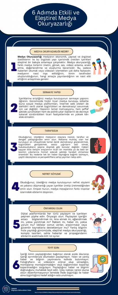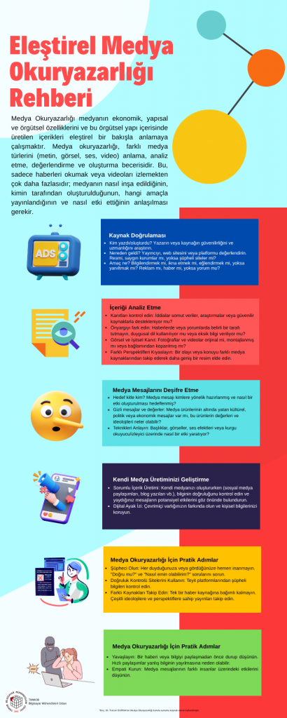 Bu kapsamda Ankara Üniversitesi İletişim Fakültesi Öğretim Üyesi Doç. Dr. Tezcan DURNA’nın hazırlamış olduğu Medya Okuryazarlığı sunumundan faydalanarak hazırladığımız “6 Adımda Etkili ve Eleştirel Medya Okuryazarlığı” ve “Eleştirel Medya Okuryazarlığı Rehberi” başlıklı infografikleri sizlerle paylaşıyoruz. Doç Dr. Tezcan DURNA’ya katkı ve yardımlarından dolayı teşekkür ederiz.